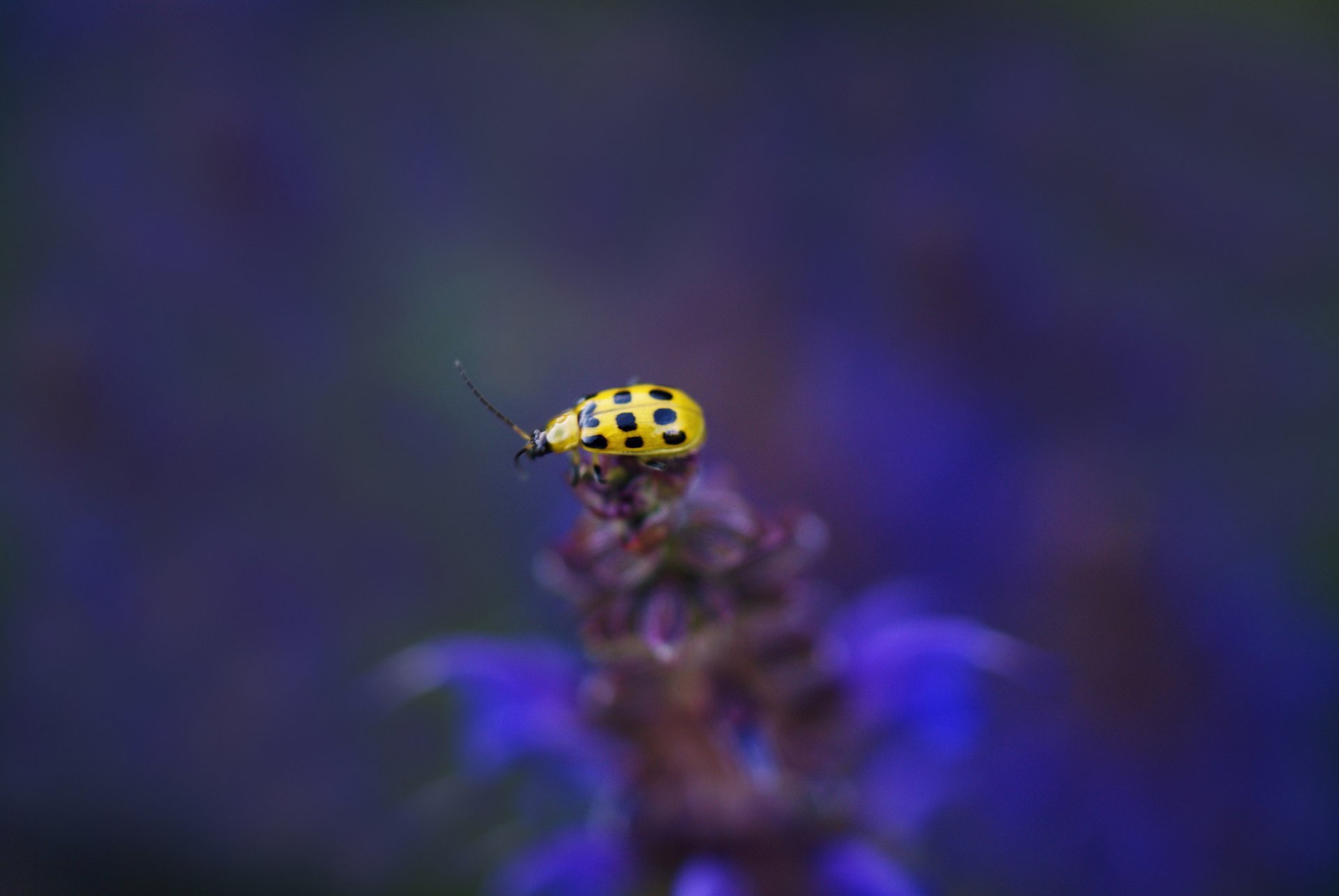 Insecto amarillo en la flor. desenfoque en la plantaInsecto amarillo en la flor. Desenfoque en la planta