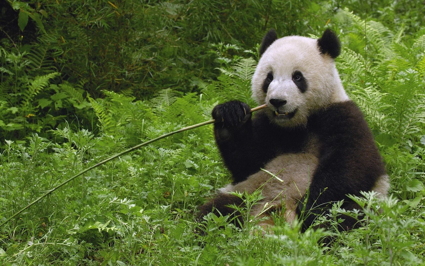 Un Panda vivo come bambú en la hierba verde. Enimel