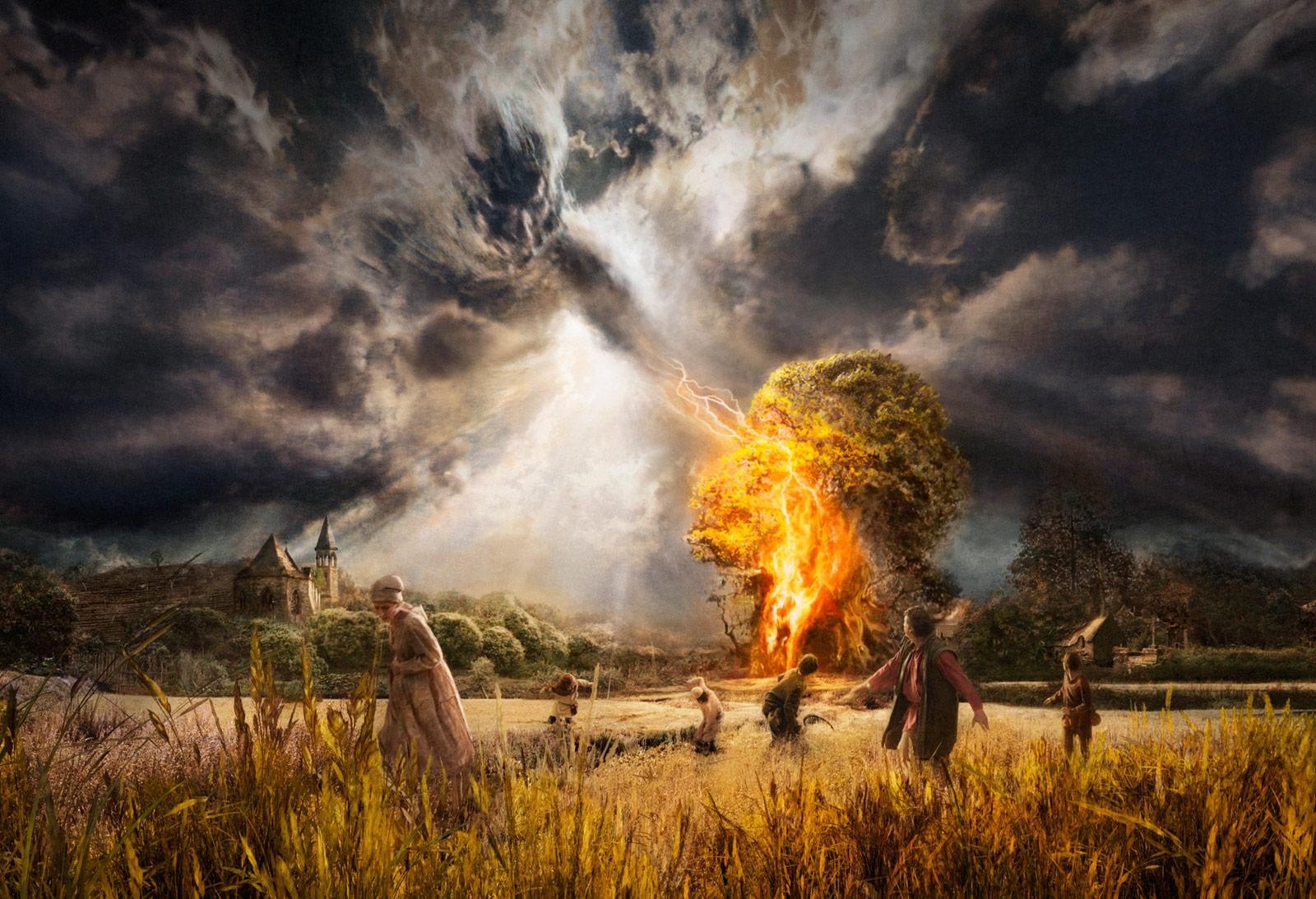 Vista de la ciudad nocturna desde la ventana del castillo medieval