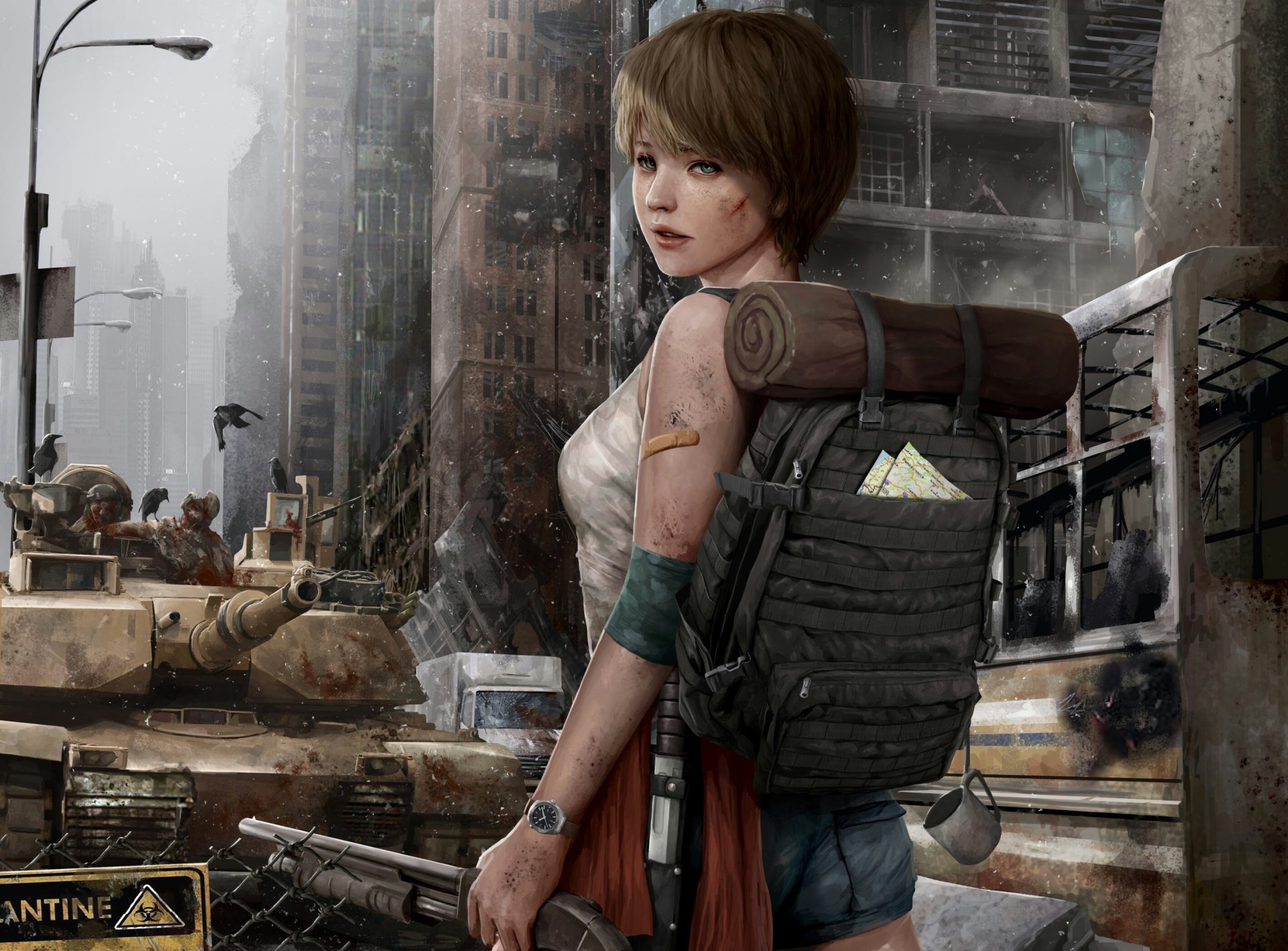 Dibujo de chicas con ropa oscura en un gran camino post-apocalípticoDibujo de chicas con ropa oscura en un gran camino post-apocalíptico
