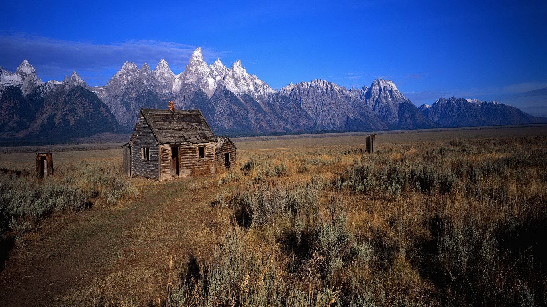 Cabaña abandonada en la estepa en el fondo de las montañasCabaña abandonada en la estepa en el fondo de las montañas