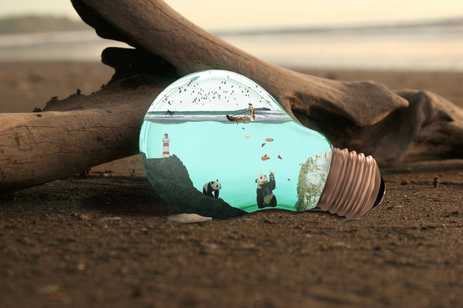 Bombilla con ilustración de pandas jugando