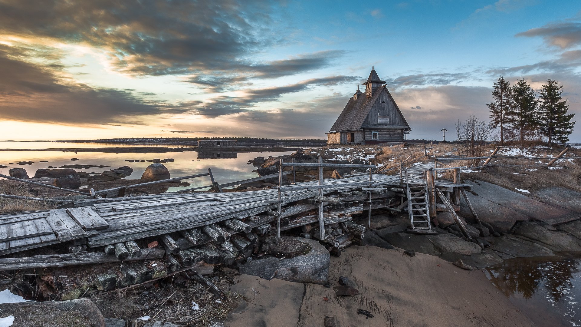 Iglesia de madera. Puente de madera. Puesta de sol en el río