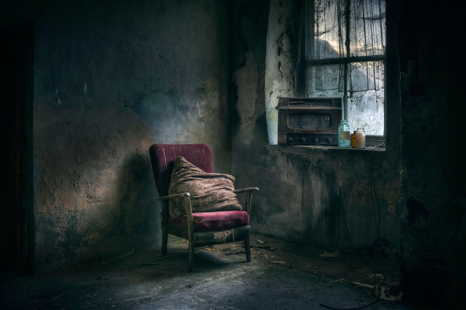 Silla sucia con cojín y ventana con Radio
