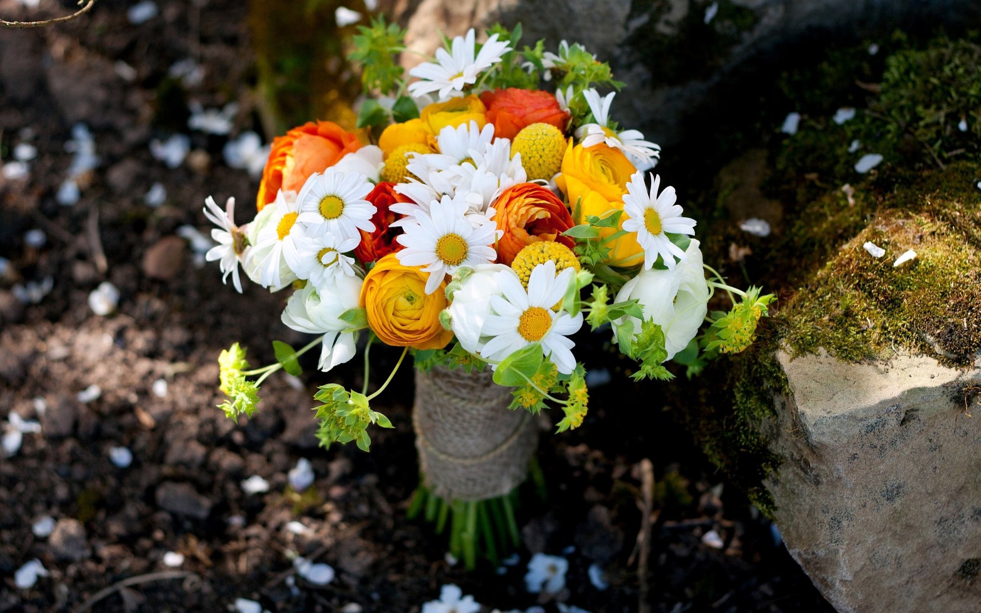 Ramo de flores brillantes en el fondo de los recién casadosRamo de flores brillantes en el fondo de los recién casados