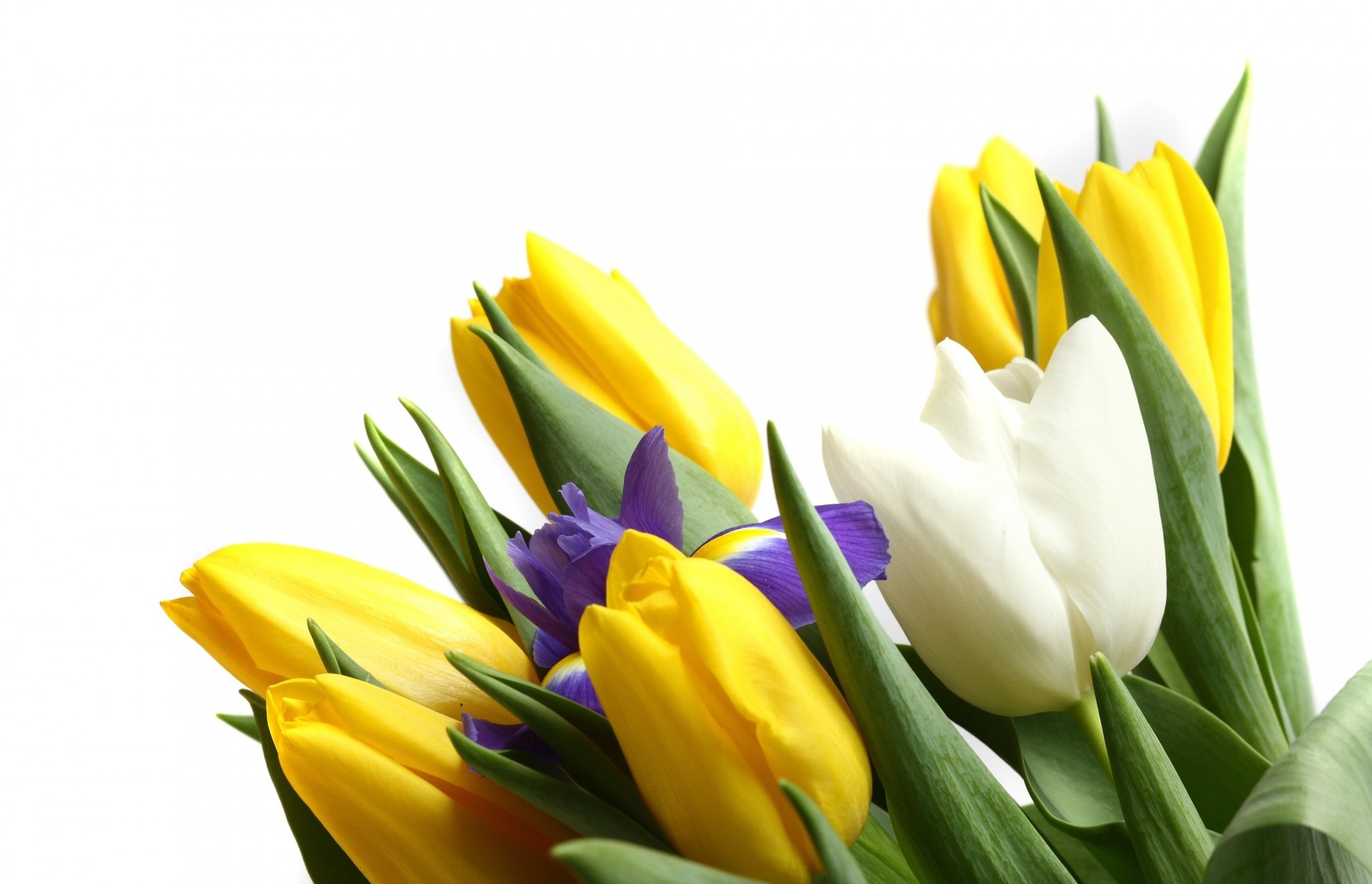 Ramo de iris y tulipanes sobre fondo blanco