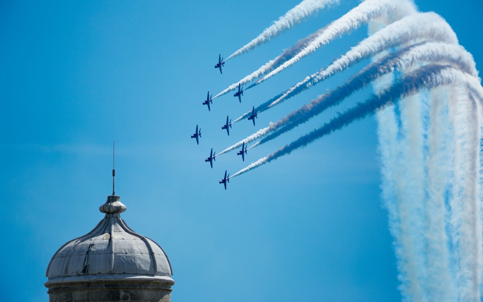 El espectáculo en el cielo aviones van cuña dejando rayasEl espectáculo en el cielo aviones van cuña dejando rayas