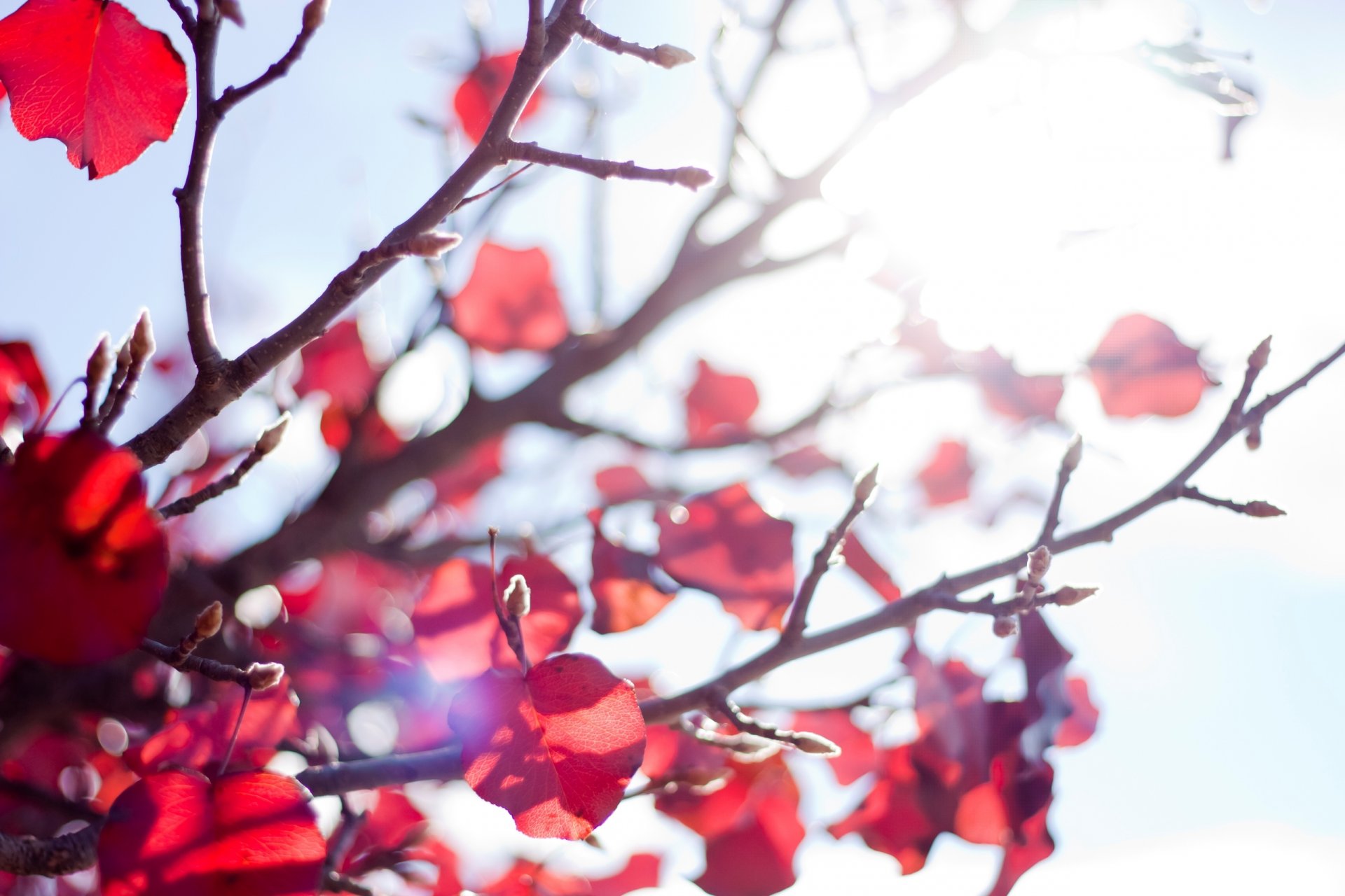 Hojas rojas de otoño. rayos de sol en las hojas rojasHojas rojas de otoño. Rayos de sol en las hojas rojas