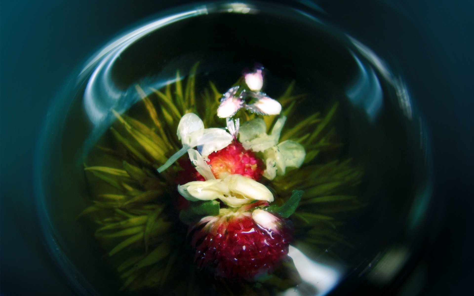 Jarrón de vidrio con flores de eucalipto de pie sobre la mesa