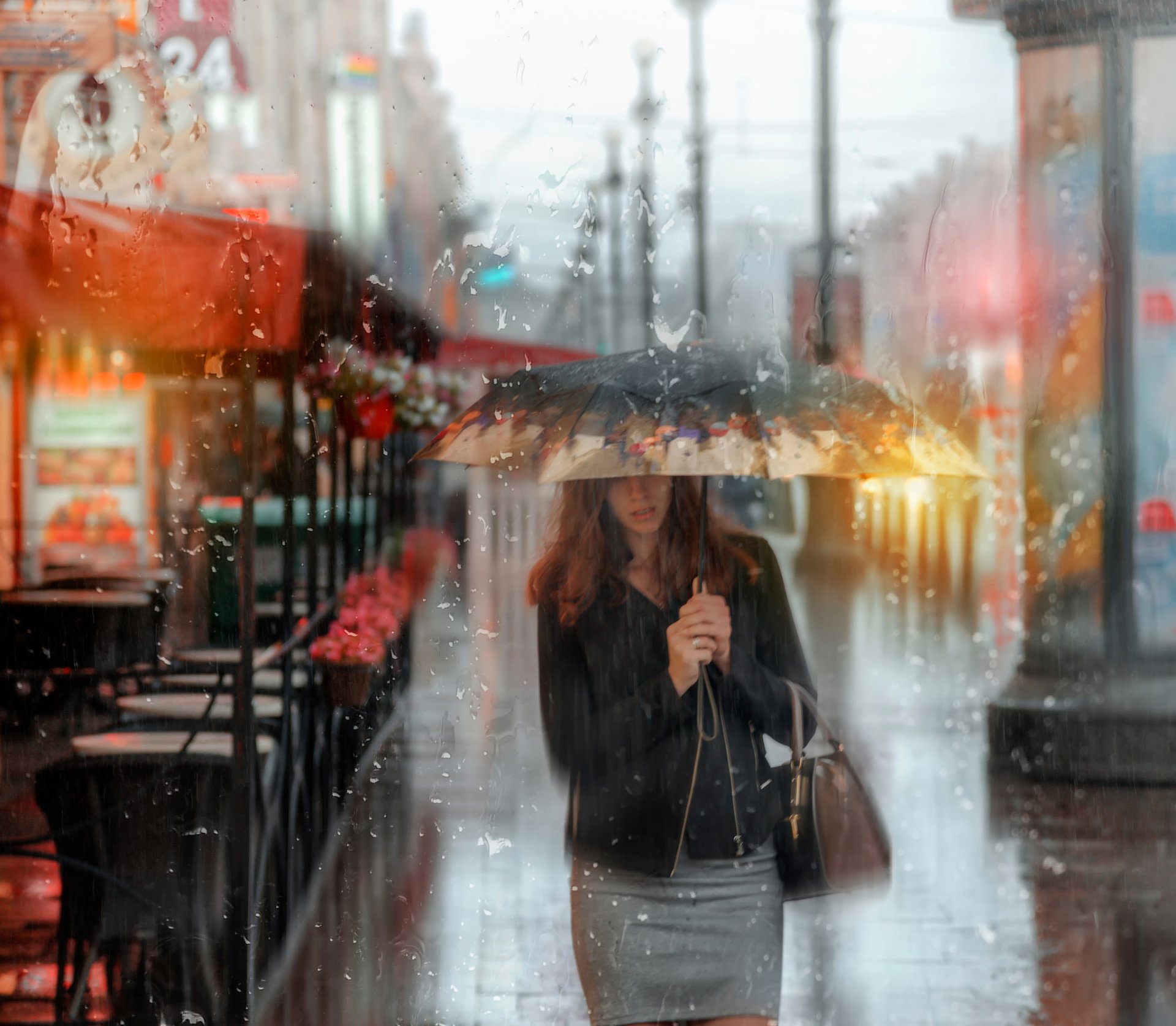 Chica bajo un paraguas en la lluvia de verano en san petersburgoChica bajo un paraguas en la lluvia de verano en San Petersburgo