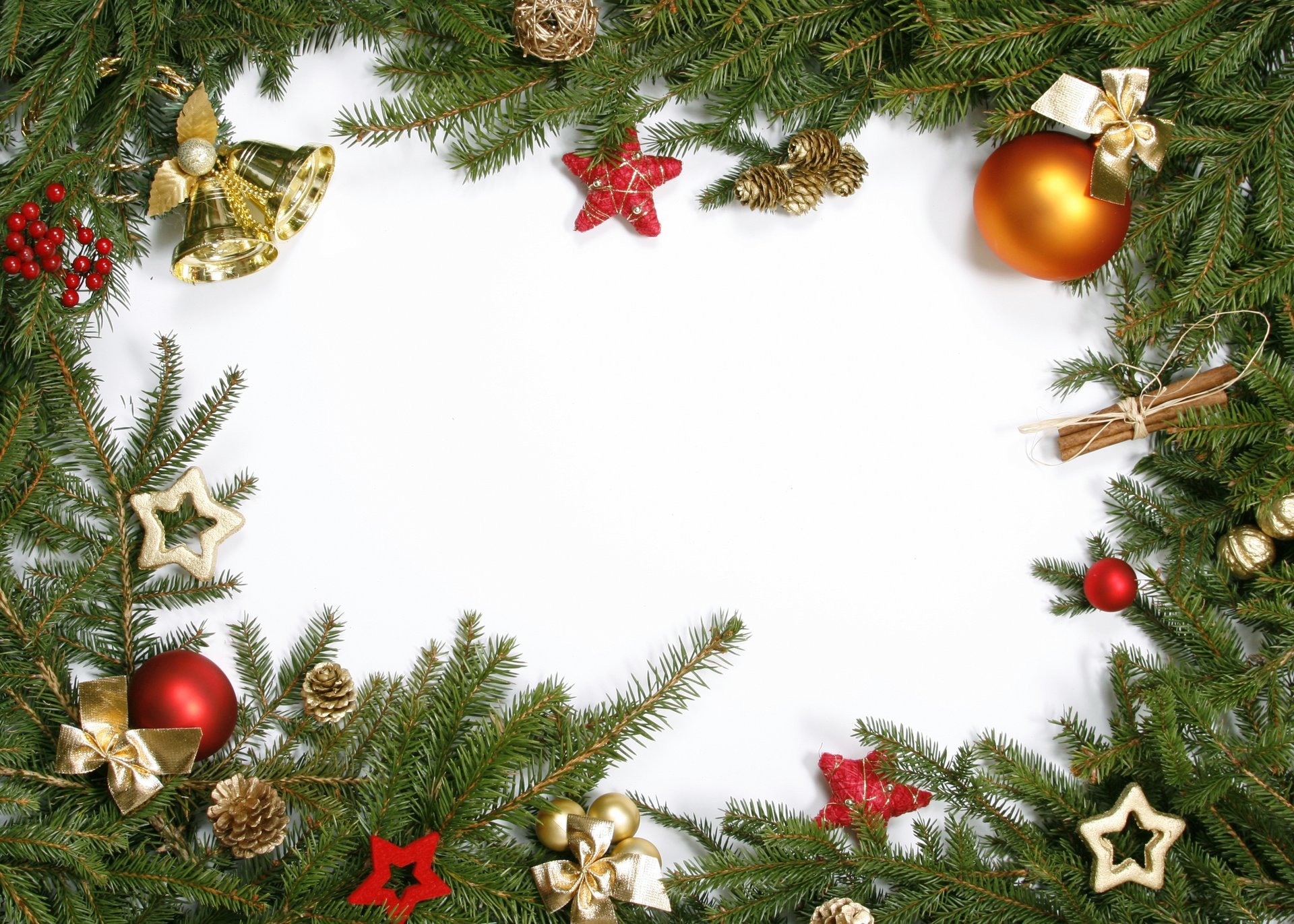 Marco de año nuevo con rama de abeto y bolas sobre fondo blancoMarco de año nuevo con rama de abeto y bolas sobre fondo blanco