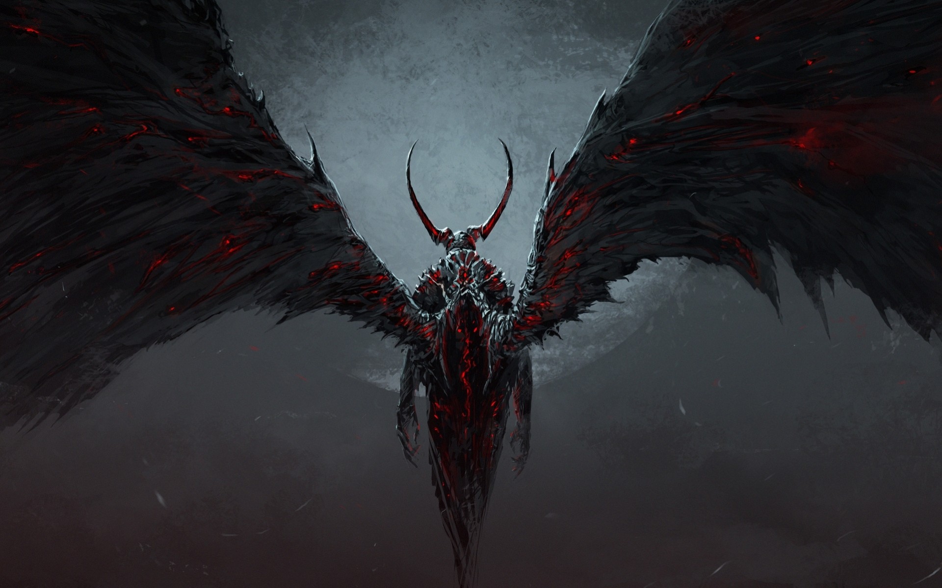 Chica demonio escarlata con alas y sable de luz en el fondo de las nubes oscurasChica demonio escarlata con alas y sable de luz en el fondo de las nubes oscuras