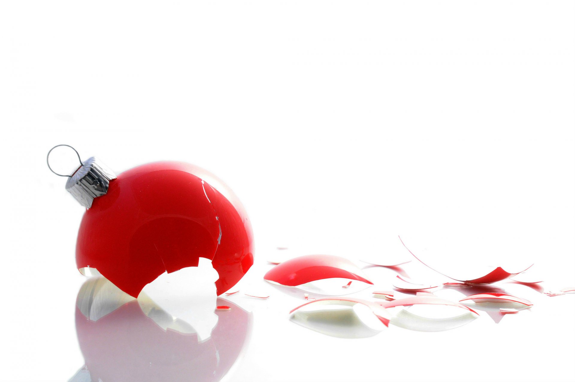 Juguete de árbol de navidad rojo roto sobre fondo blancoJuguete de árbol de Navidad rojo roto sobre fondo blanco