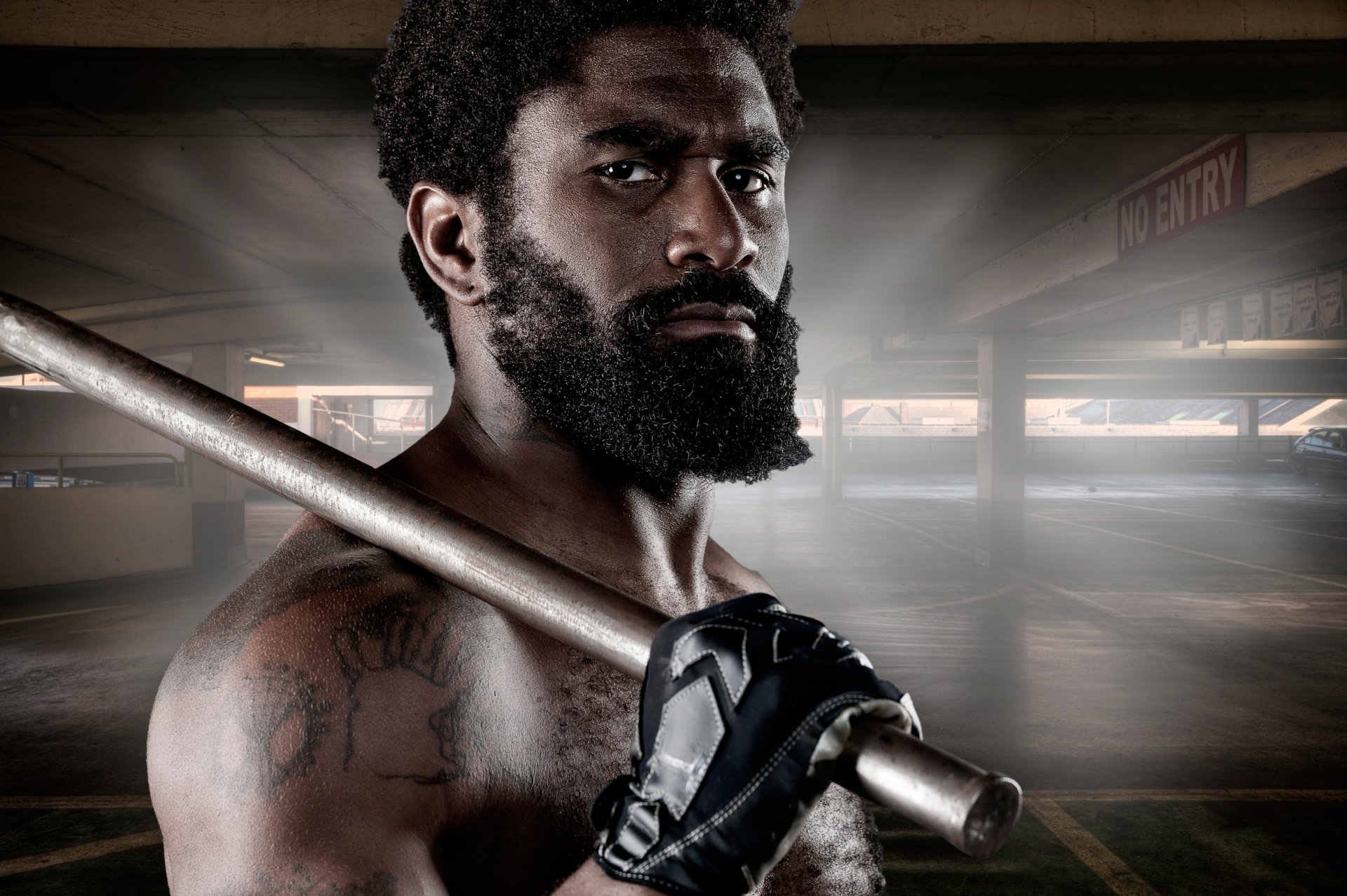 Luchador barbudo con guantes sosteniendo un tubo de hierroLuchador barbudo con guantes sosteniendo un tubo de hierro