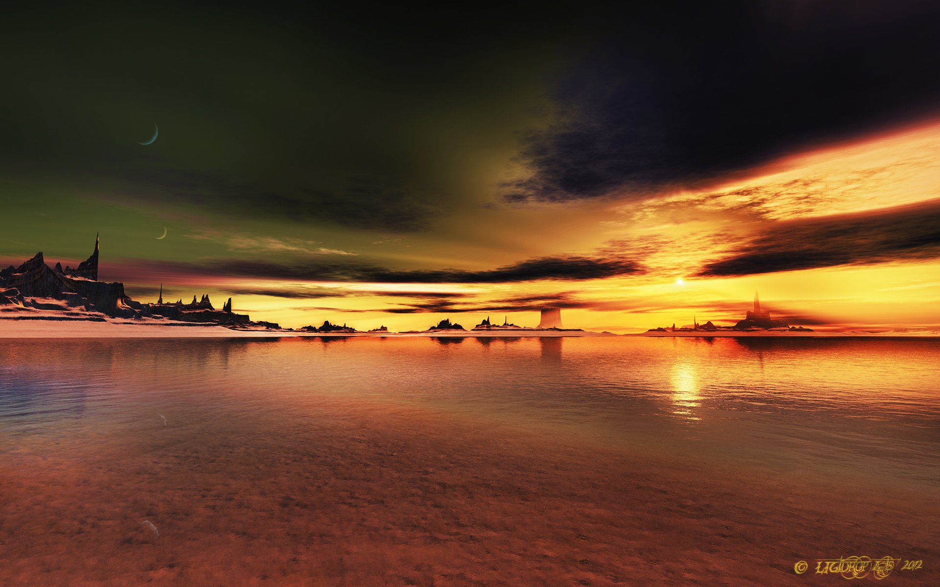 Hermosa puesta de sol junto al lago en un terreno rocoso y sin vidaHermosa puesta de sol junto al lago en un terreno rocoso y sin vida