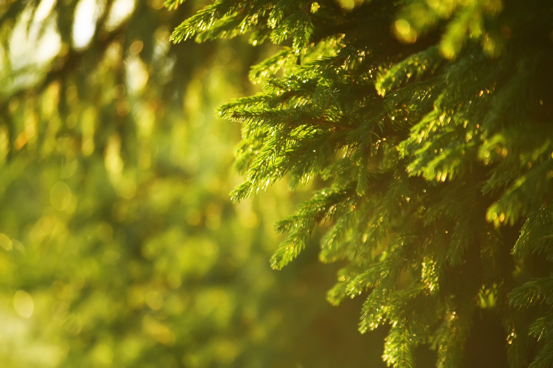 Coníferas en la niebla y un rayo de sol que atraviesa el follajeConíferas en la niebla y un rayo de sol que atraviesa el follaje