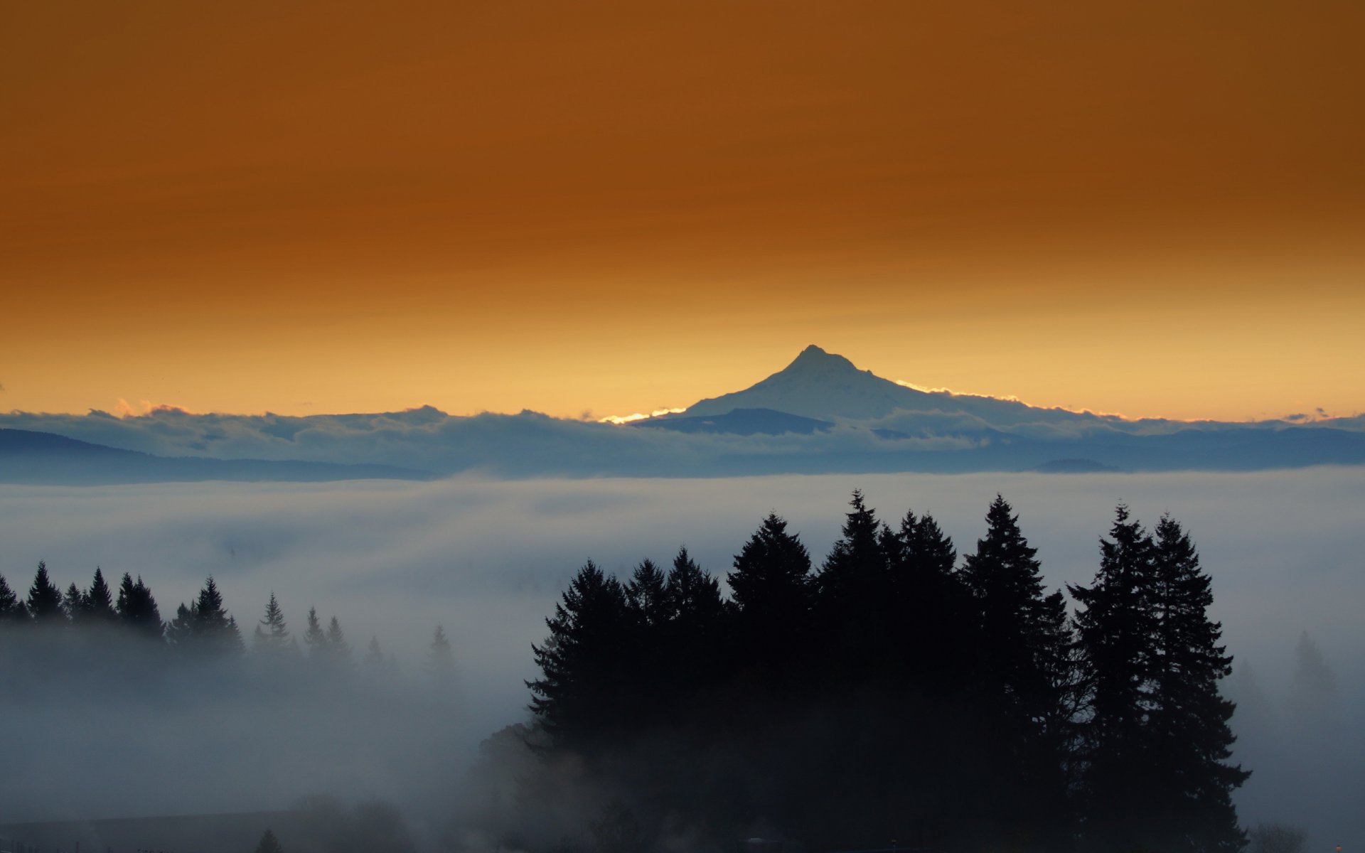 Árboles y puesta de sol sobre la cima de la montañaÁrboles y puesta de sol sobre la cima de la montaña