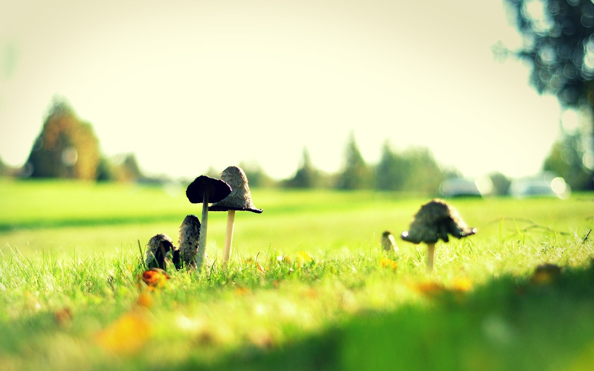 Los hongos en patas largas y delgadas crecen en un claro de bosque verde soleado
