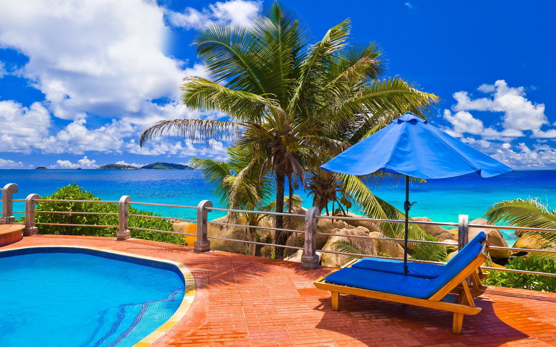 Hermoso paisaje de agua azul, hierba y cielo azul