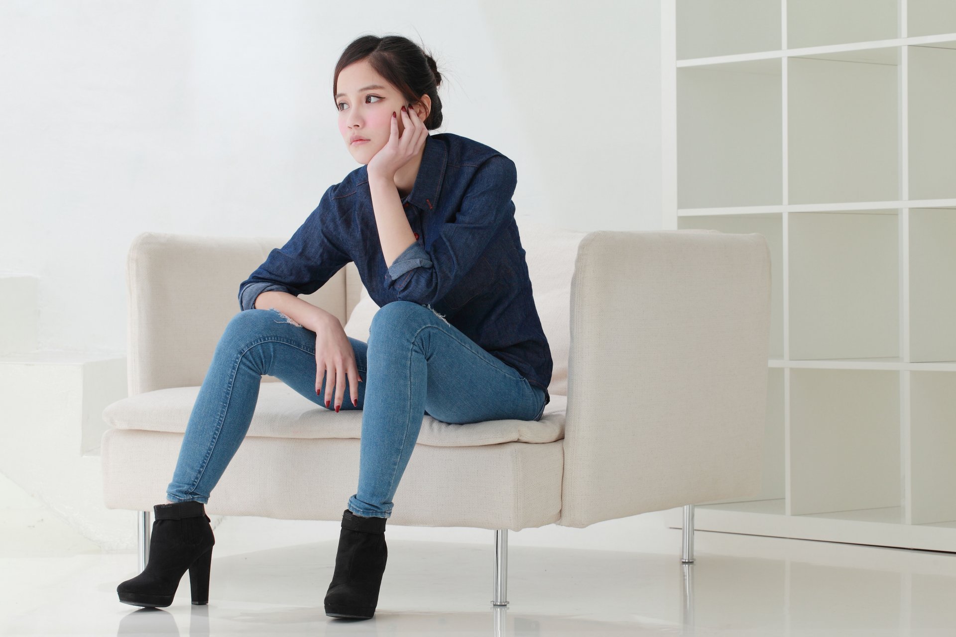 Pelirroja oriental chica en jeans sobre un fondo blancoPelirroja Oriental chica en jeans sobre un fondo blanco