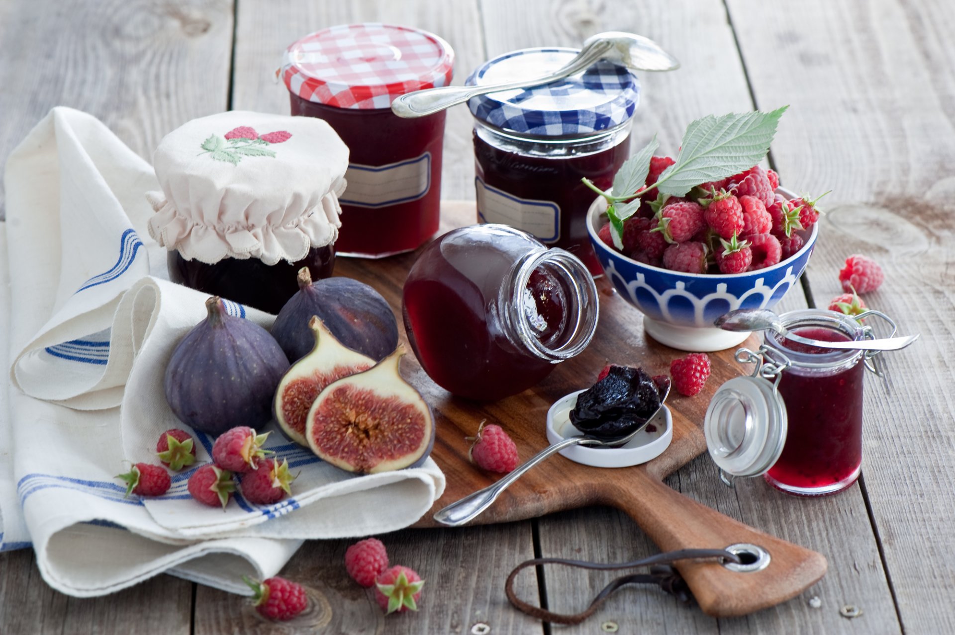 Deliciosa mermelada y mermelada de frambuesas e higos en el tableroDeliciosa mermelada y mermelada de frambuesas e higos en el tablero