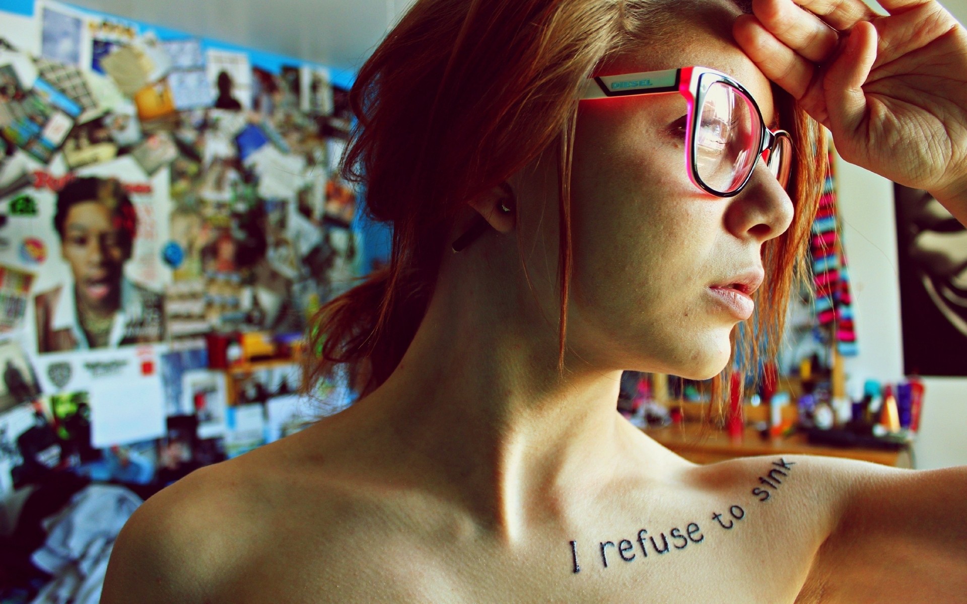 Pelirroja chica con tatuajes en la clavícula
