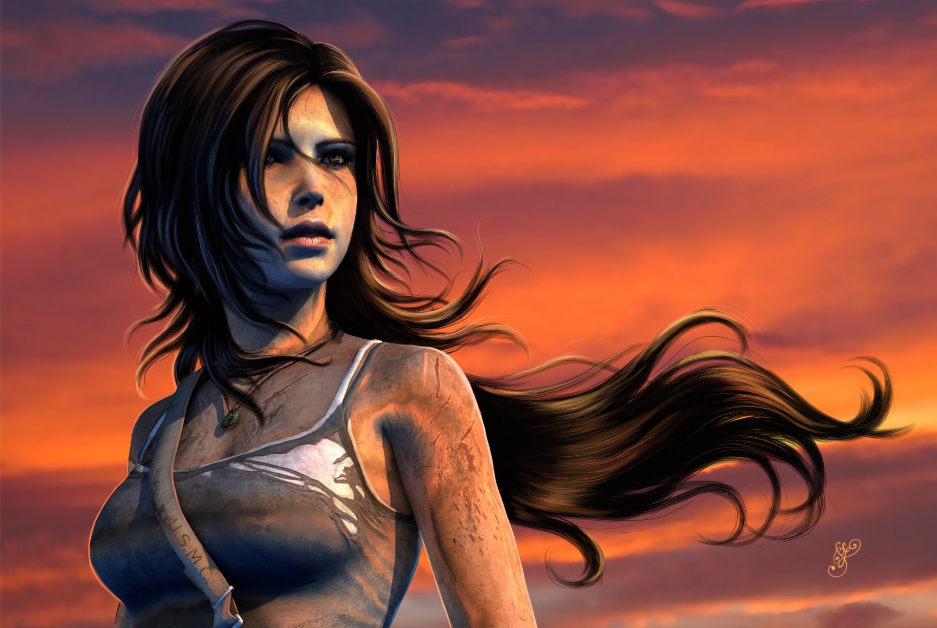 Arte de lara croft con una pistola y una escopeta en el fondo de las rocas en el bosqueArte de Lara Croft con una pistola y una escopeta en el fondo de las rocas en el bosque
