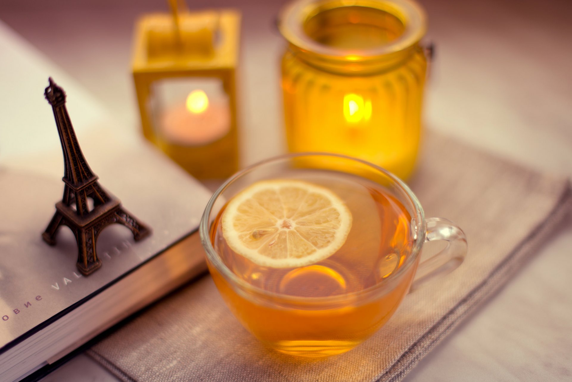 Sobre la mesa hay una taza de té con limón de la torre Eiffel y velas