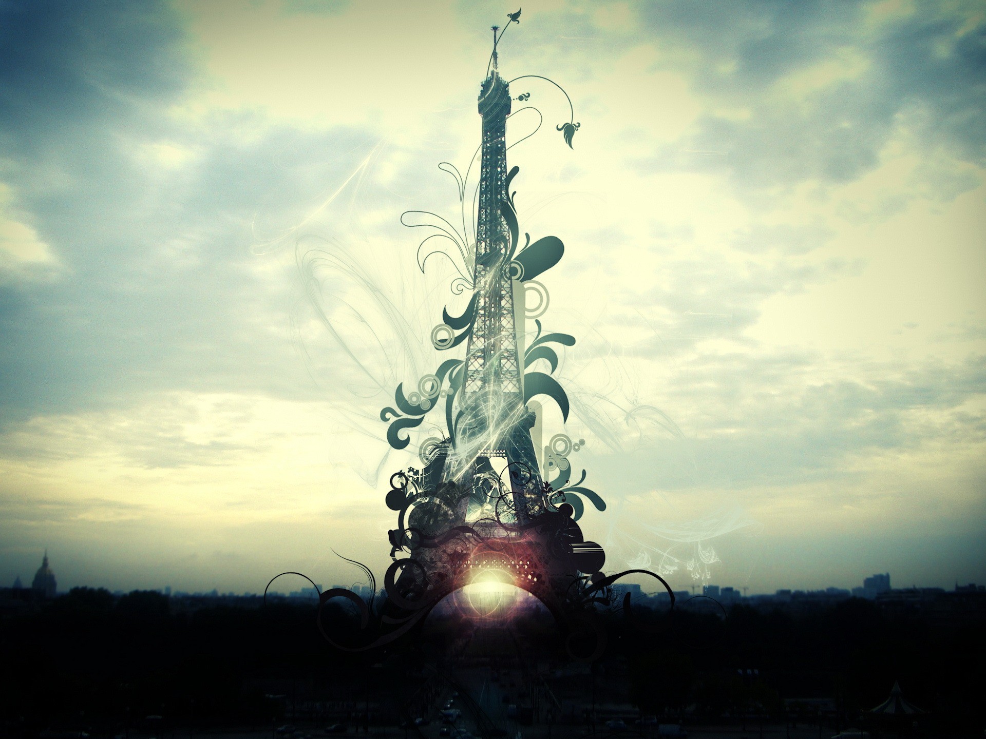 La Torre Eiffel. Hierba verde y nubes