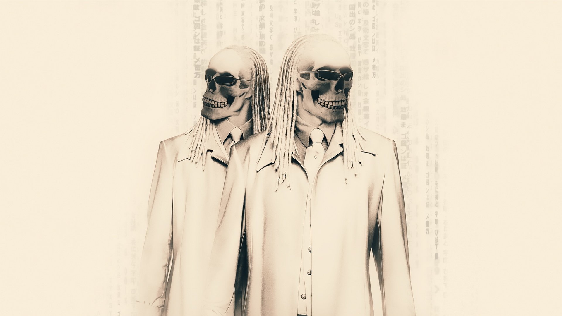 Grupo maroon 5 en trajes de pie en un fondo oscuroGrupo maroon 5 en trajes de pie en un fondo oscuro