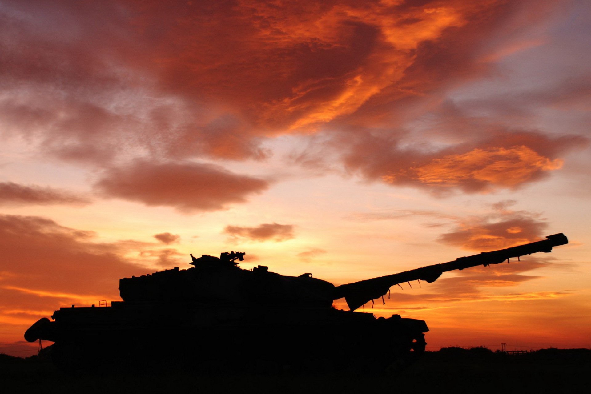 Tanque en el fondo de la hermosa puesta de sol de la tardeTanque en el fondo de la hermosa puesta de sol de la tarde