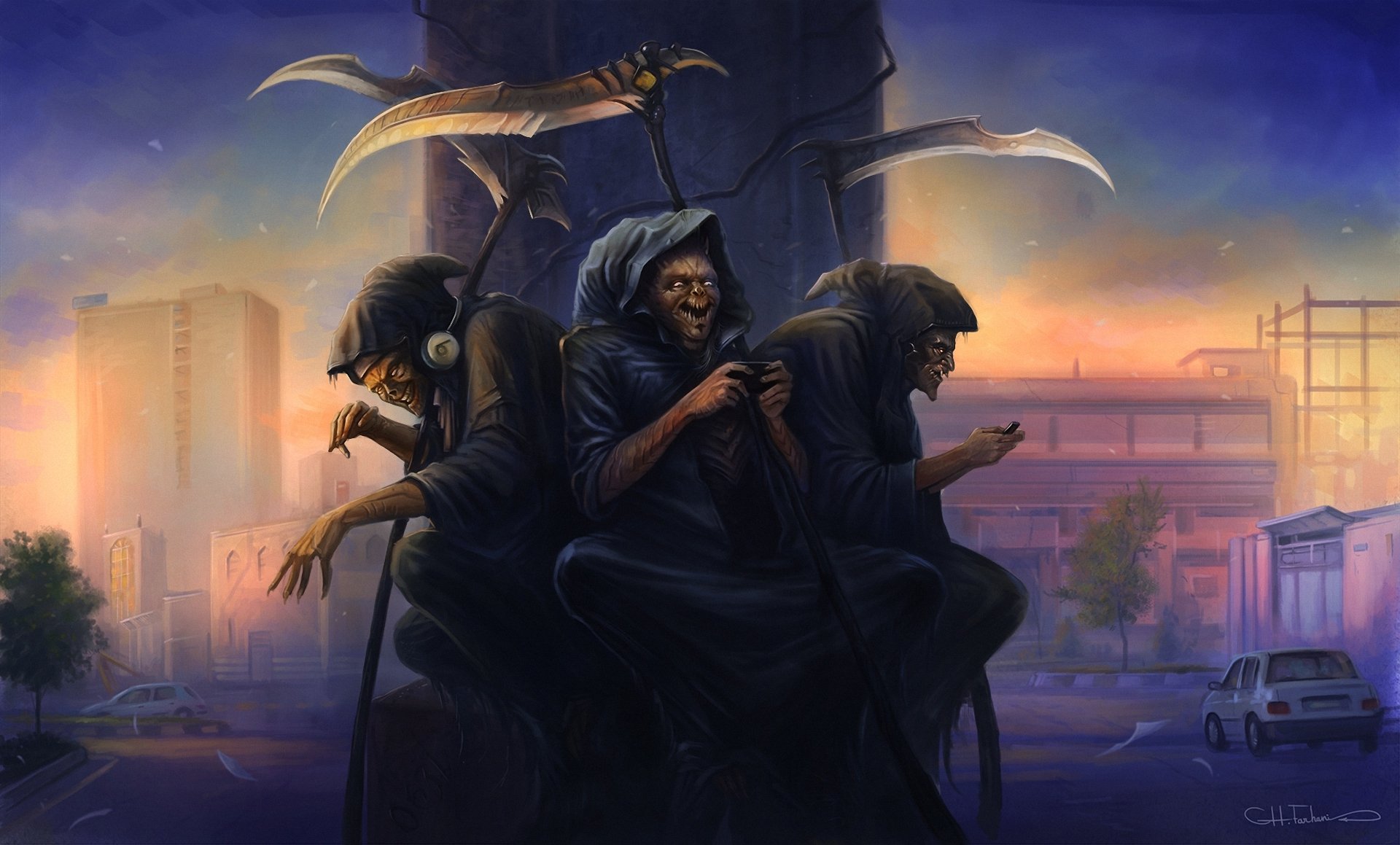En el fondo gris y azul de la ciudad congelada destruida, la imagen de tres soldadosEn el fondo gris y azul de la ciudad congelada destruida, la imagen de tres soldados