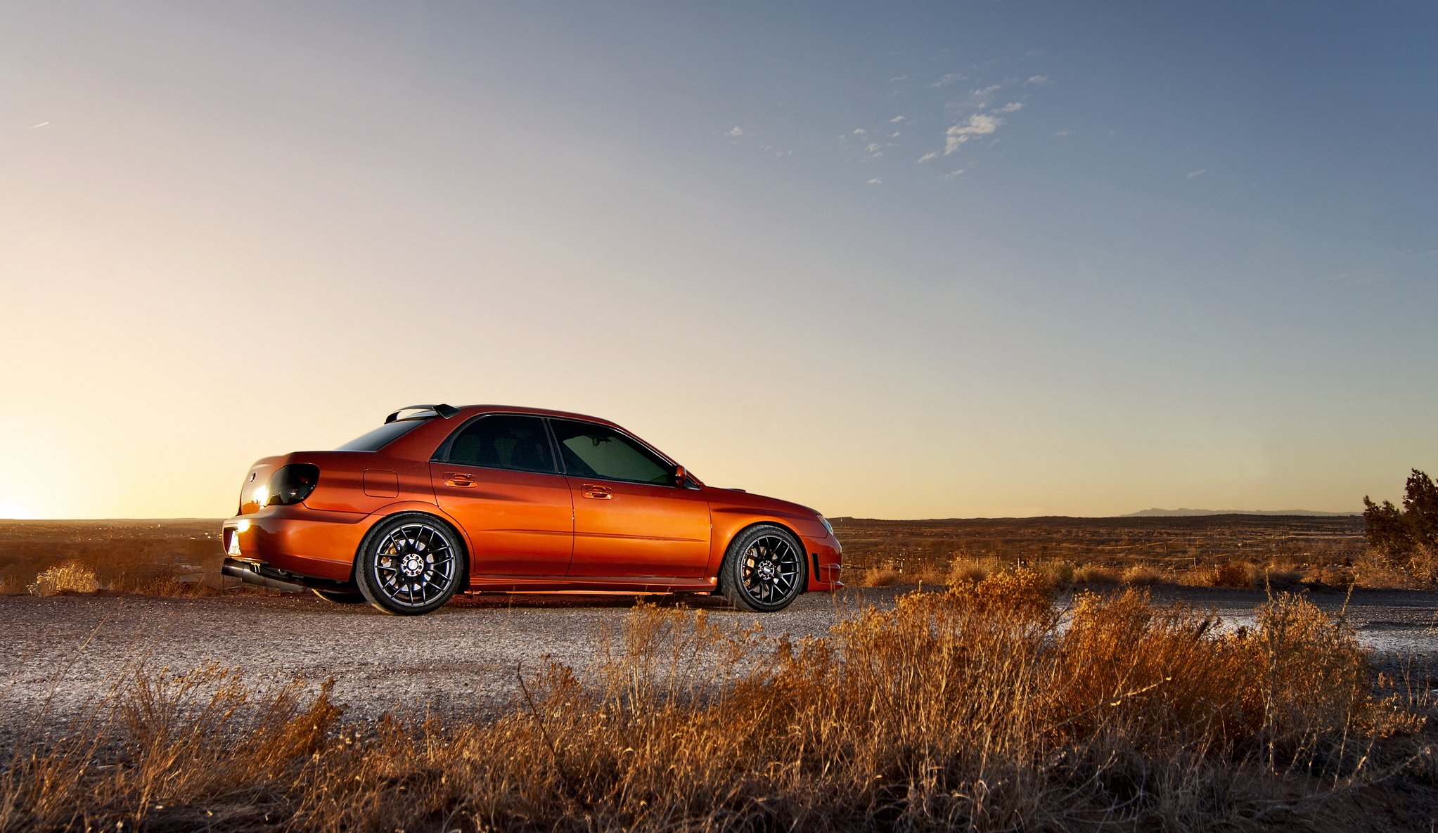 Subaru impreza azul brillante en la carretera de otoñoSubaru impreza azul brillante en la carretera de otoño