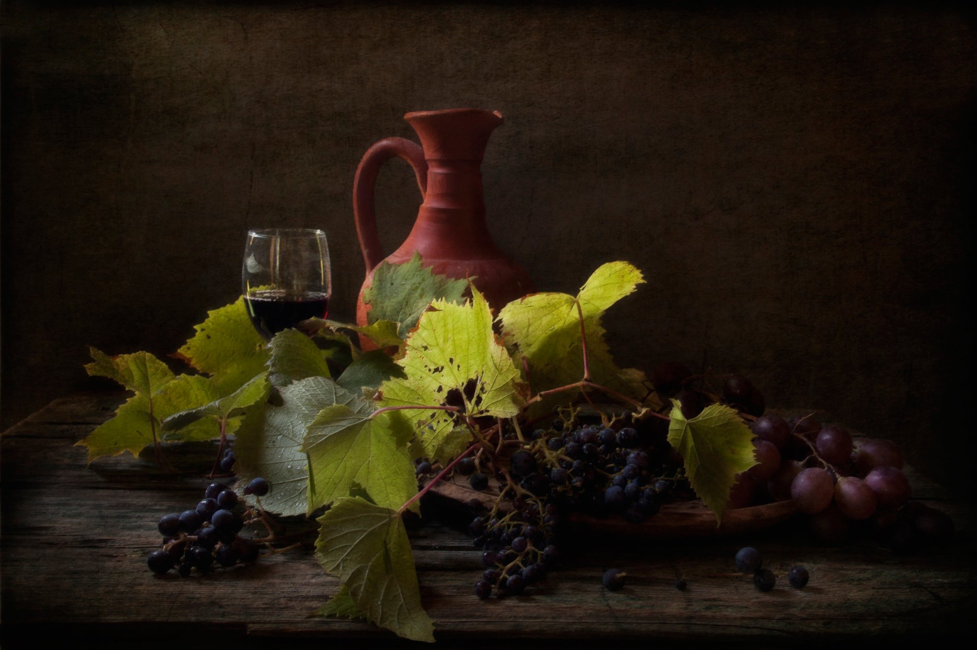 Una jarra que se ahoga en las uvas y sus hojas