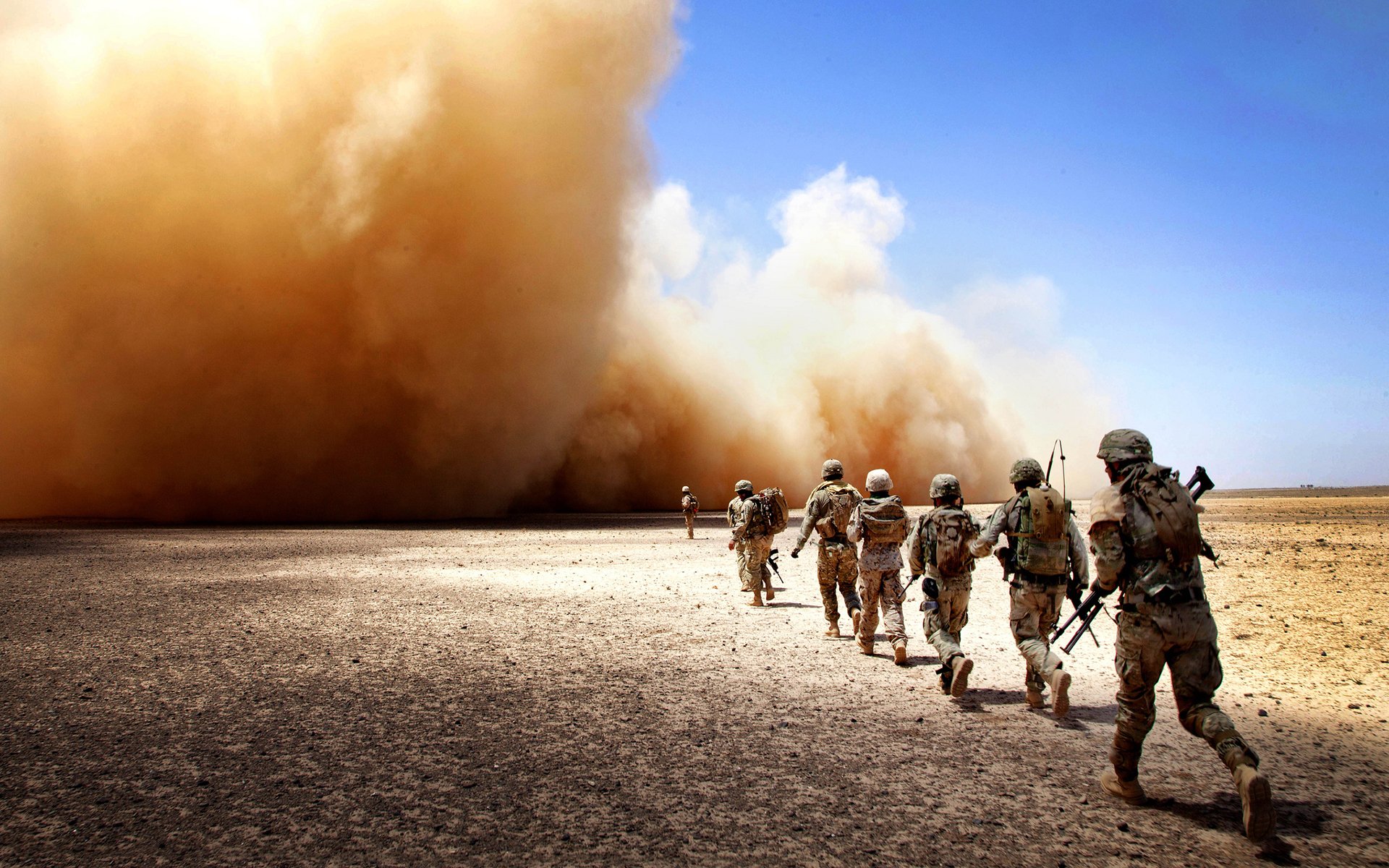 En el desierto van con cajas en la cabeza dos hombres que se encuentran con una chica encapuchada