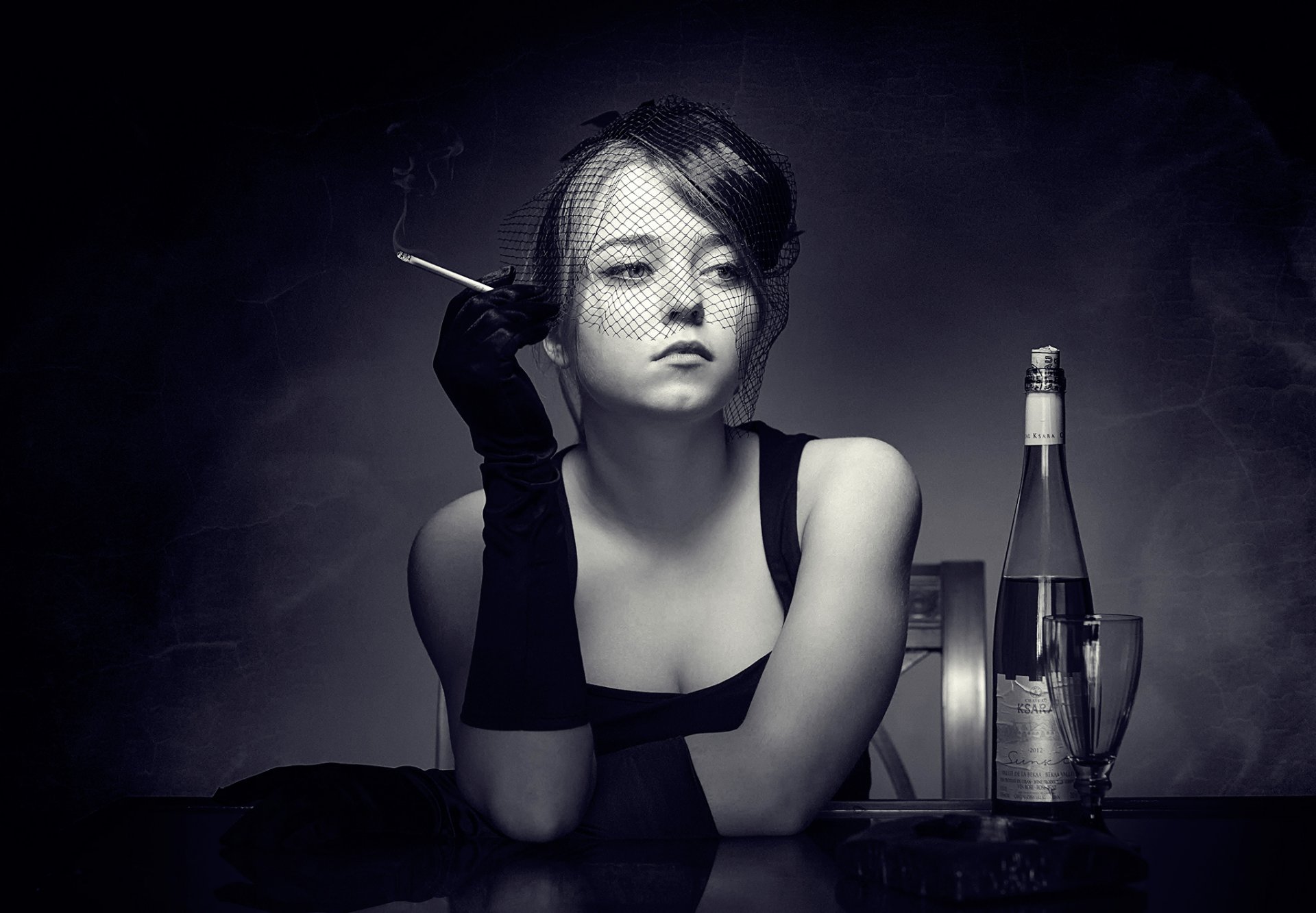 Viuda de negro con un cigarrillo y una botella en un veloViuda de negro con un cigarrillo y una botella en un velo