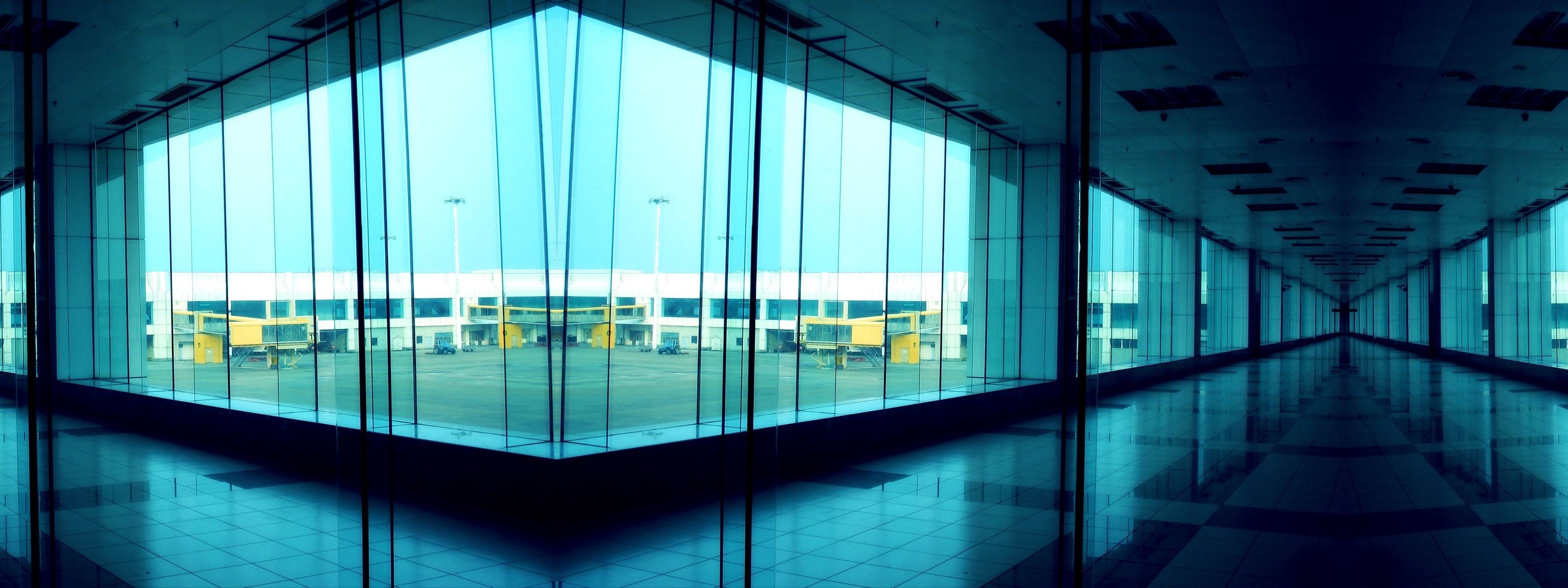 Pasillo de vidrio con ventanas con vistas al patioPasillo de vidrio con ventanas con vistas al patio