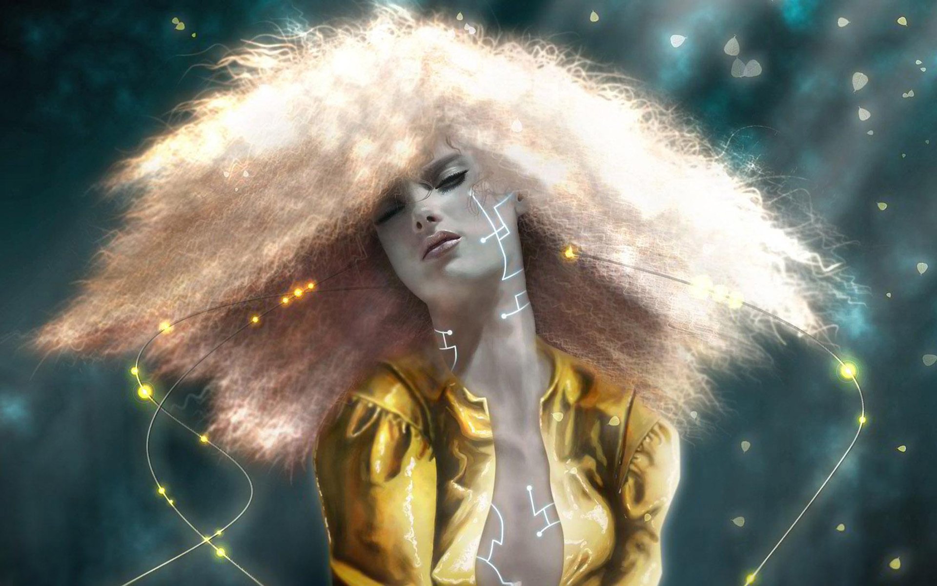 Rubia con el pelo curvilíneo sobre un fondo oscuroRubia con el pelo curvilíneo sobre un fondo oscuro