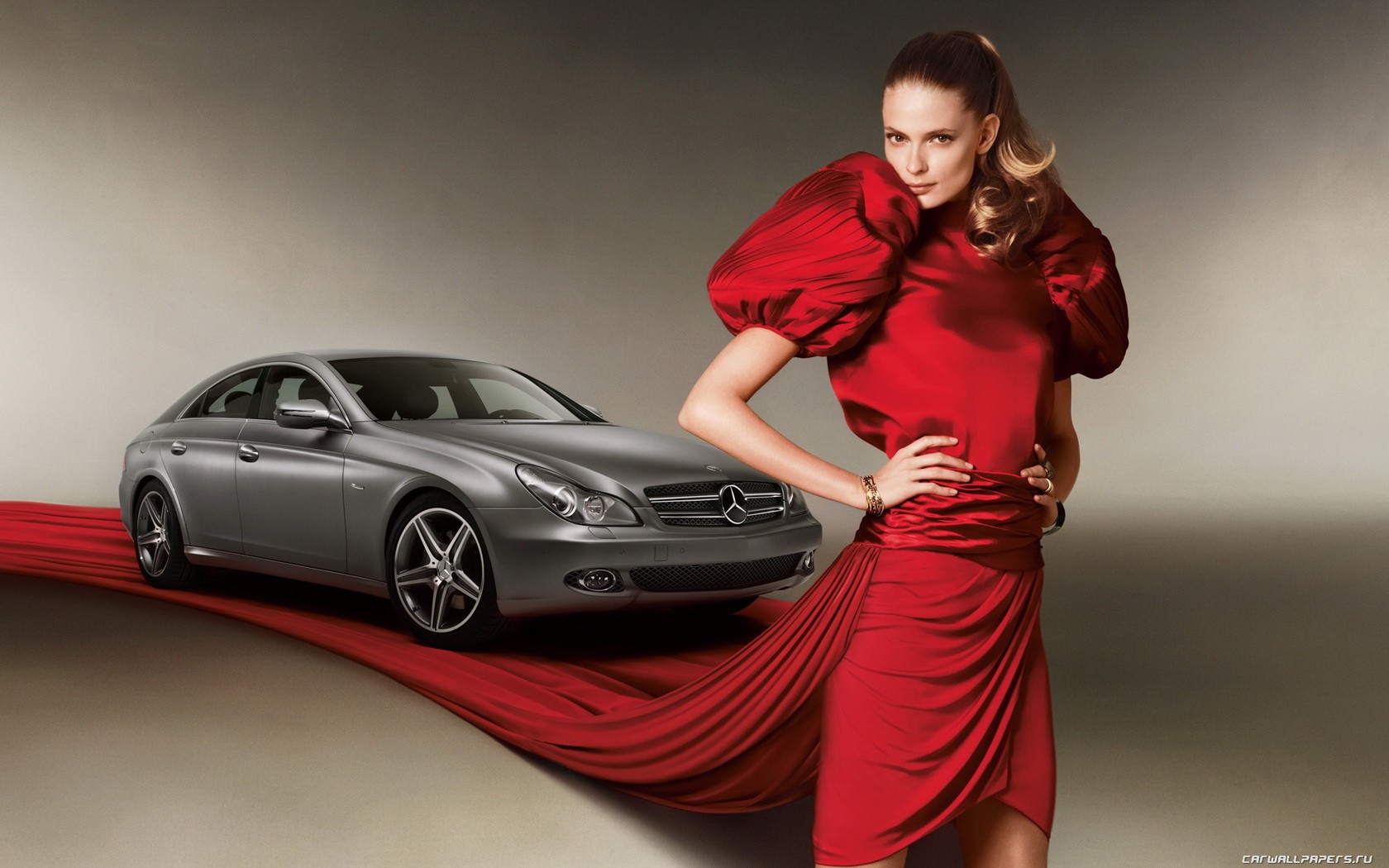 Modelo con vestido rojo en el fondo del coche de Mercedes