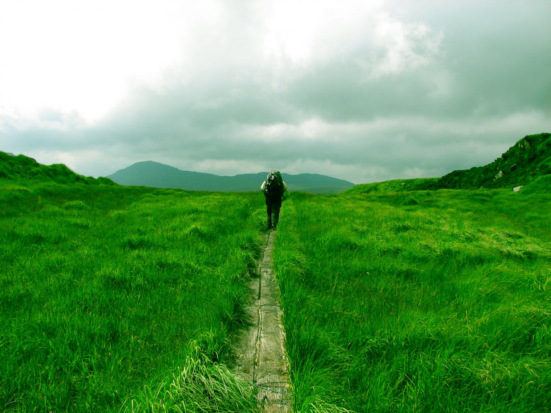 El viajero camina por el sendero entre la hierba verdeEl viajero camina por el sendero entre la hierba verde