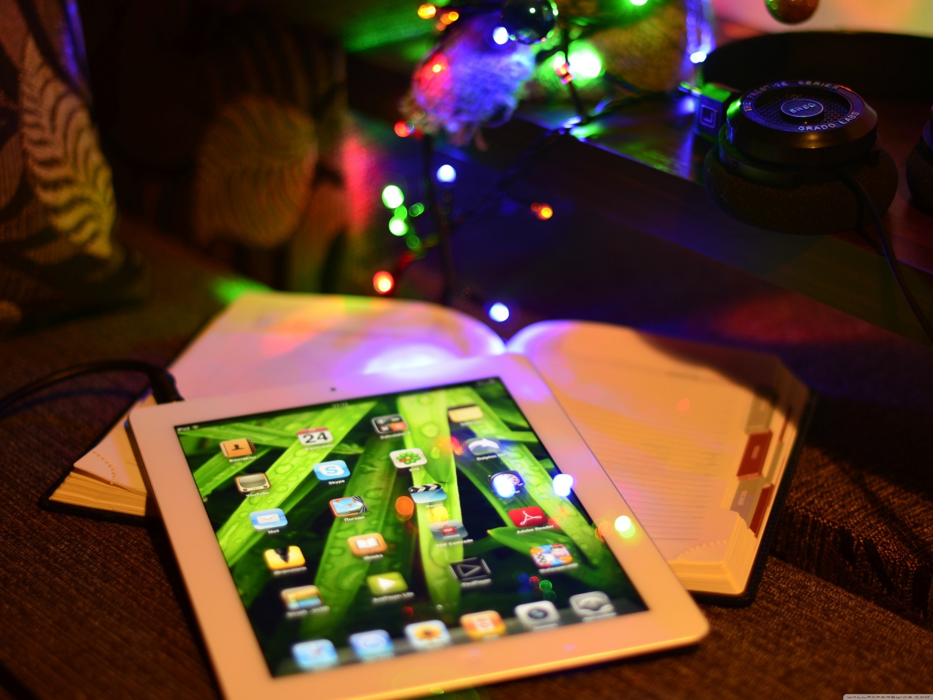 Imagen en el libro de escritorio con tableta y guirnaldaImagen en el libro de Escritorio con tableta y guirnalda