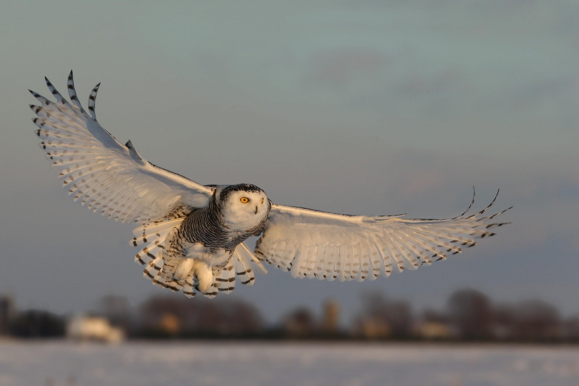 Búho con ojos amarillos brillantes volando en inviernoBúho con ojos amarillos brillantes volando en invierno