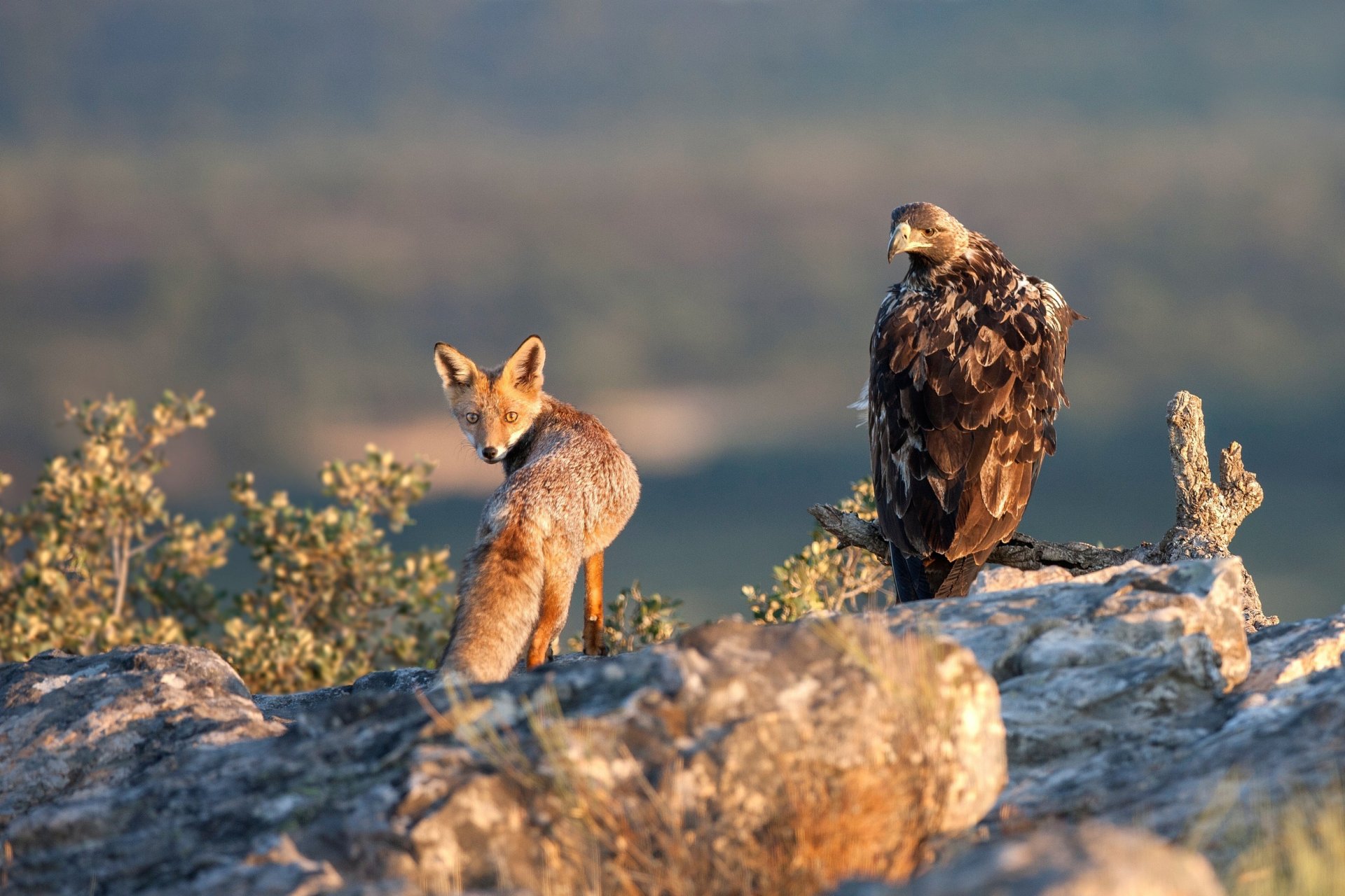 El zorro al lado del águila se dio la vuelta y mira a la cámaraEl zorro al lado del águila se dio la vuelta y Mira a la cámara
