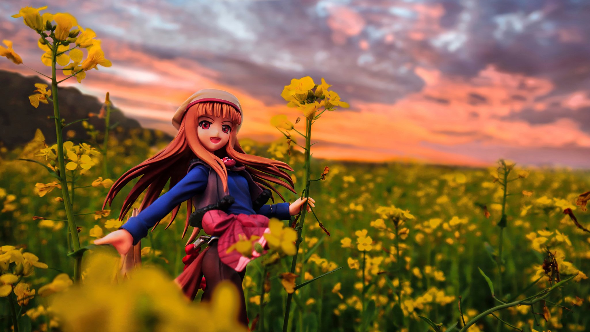 Una niña en un campo con flores amarillas