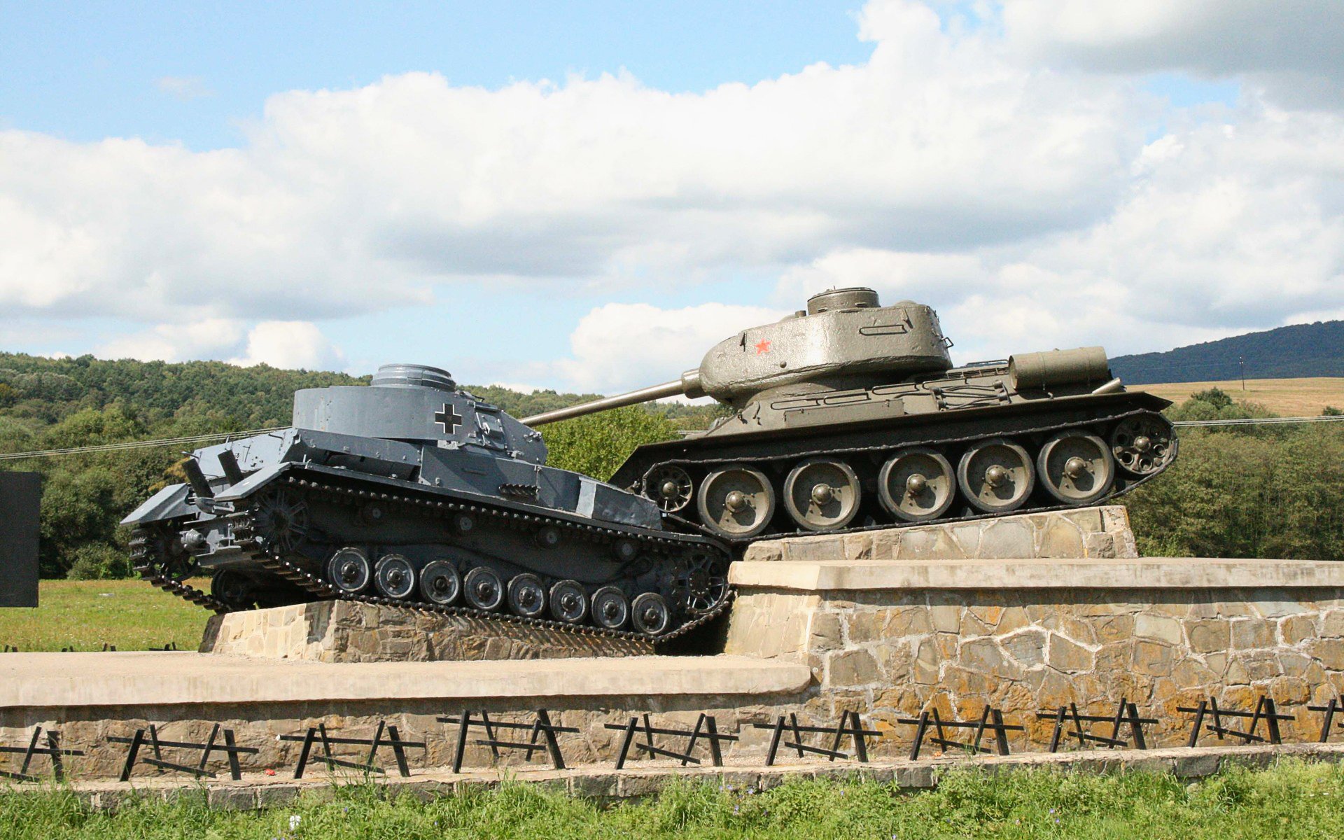 Memorial en un pedestal de piedra dos tanques en una batalla no igual
