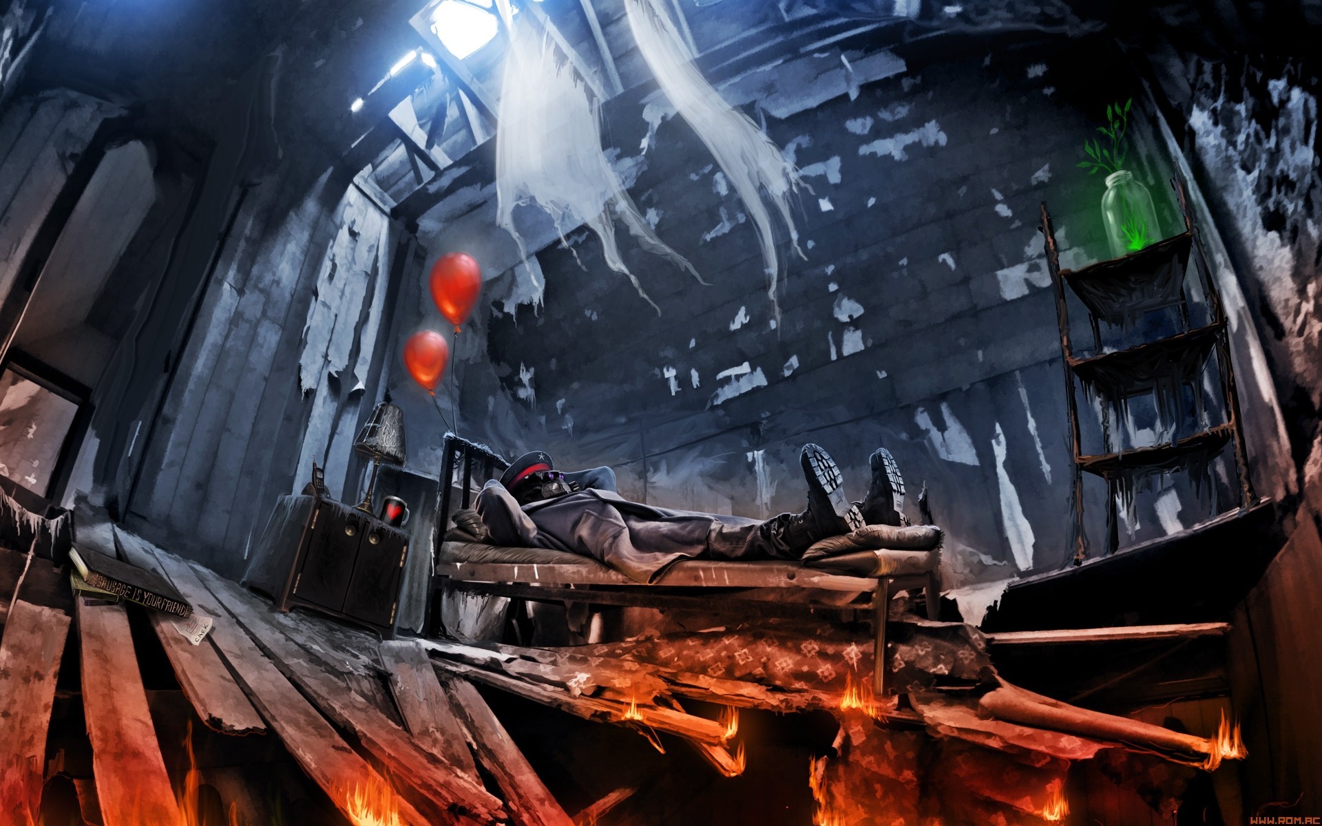 Capitán enmascarado con una taza en el fondo de las ruinas del Apocalipsis