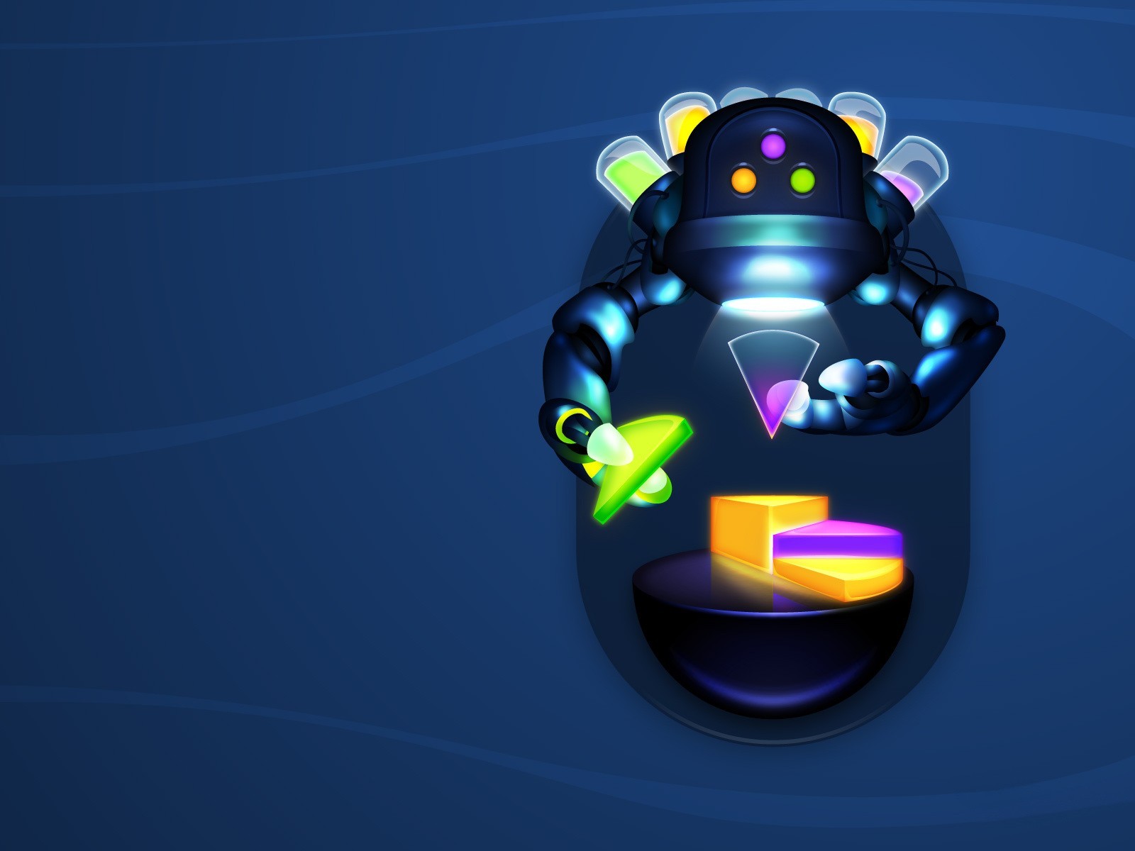 Sobre un fondo azul, el robot en sus manos sostiene elementos brillantes