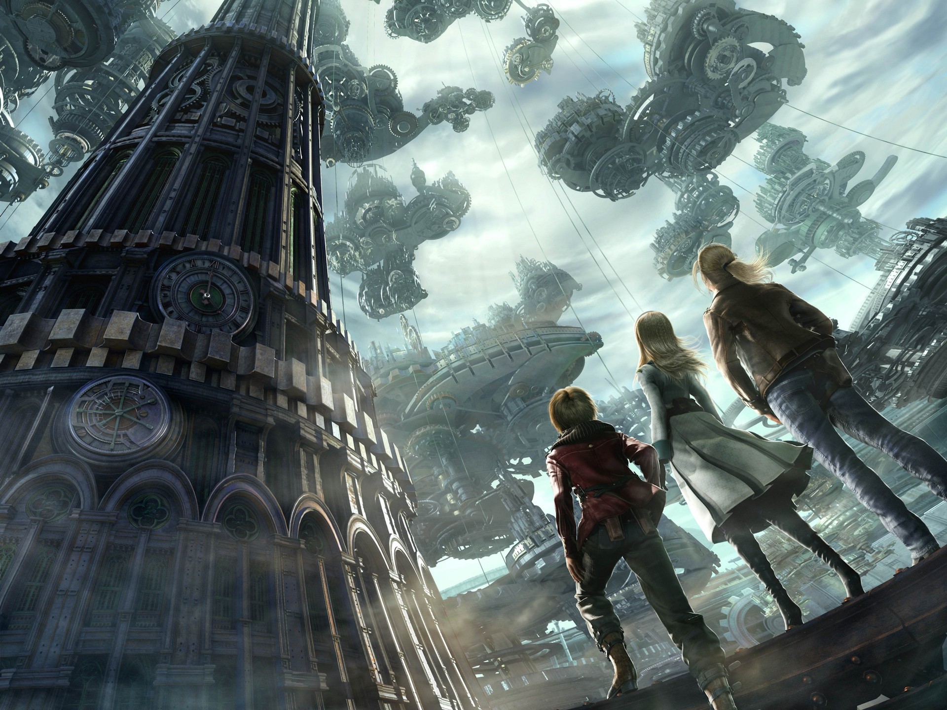Torre distorsionada, disparo desde abajo, mecanismos en el cielo
