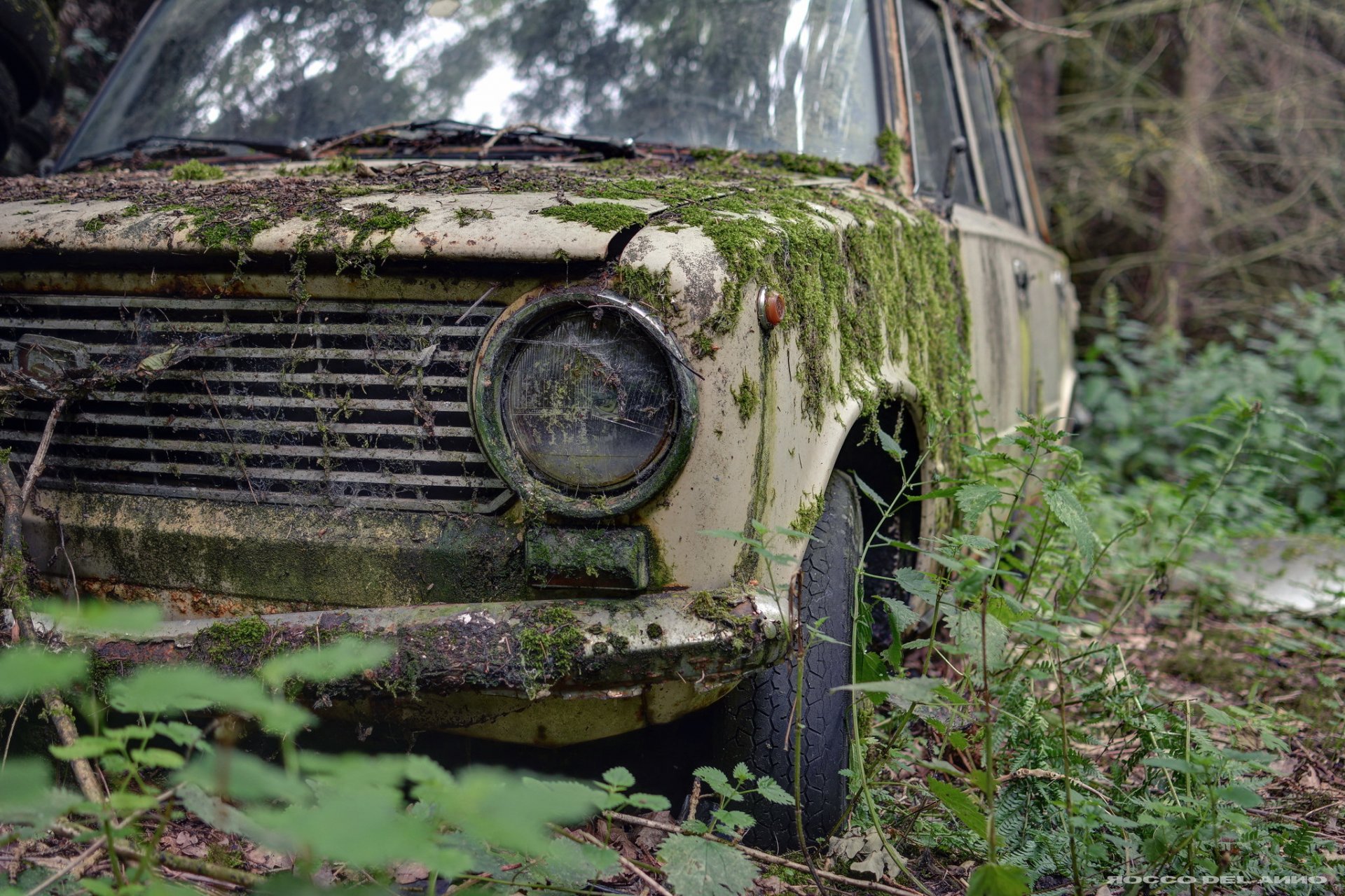 Un viejo coche cubierto de musgo se encuentra en el bosque