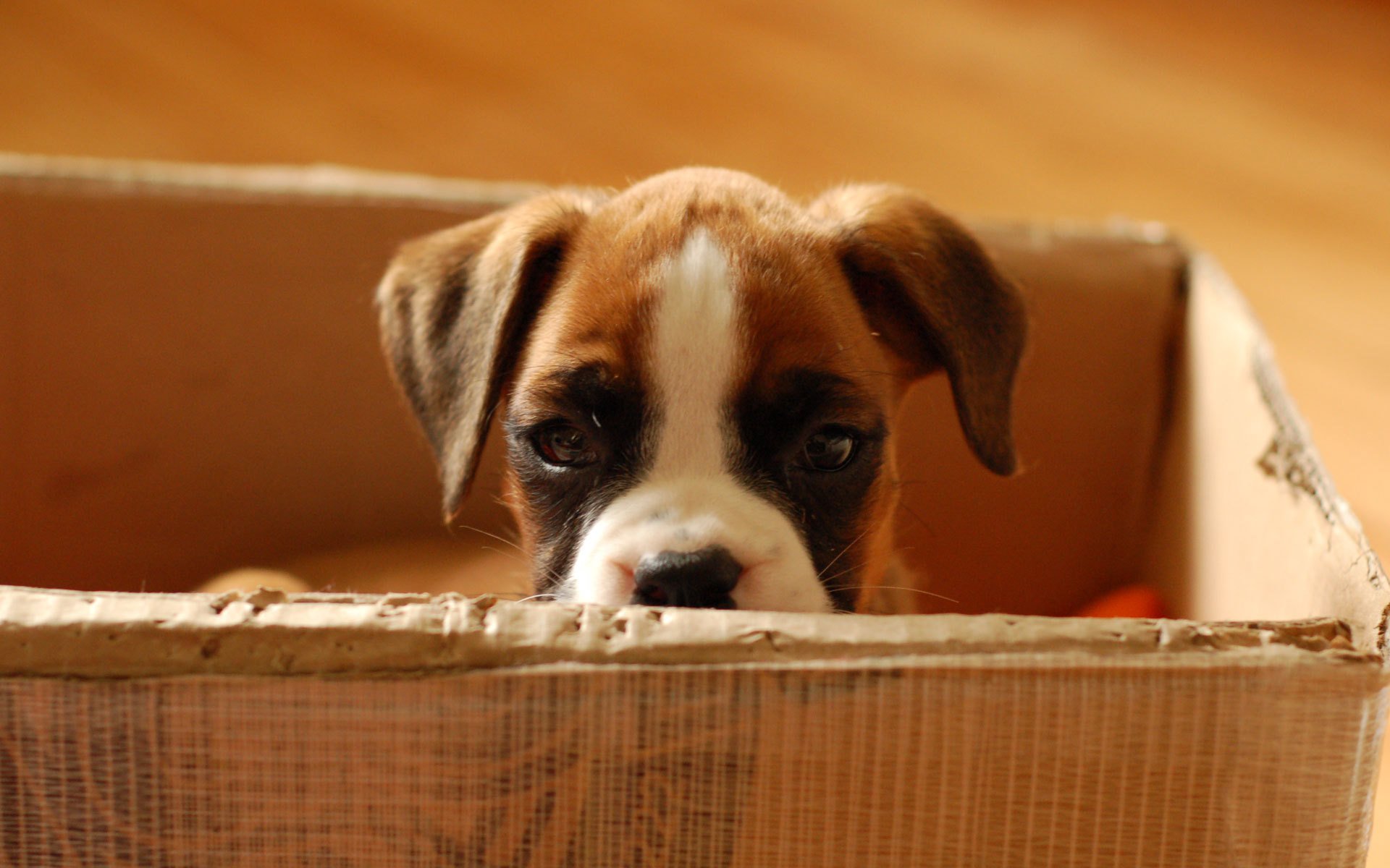 Cachorro sentado en una Caja de cartón
